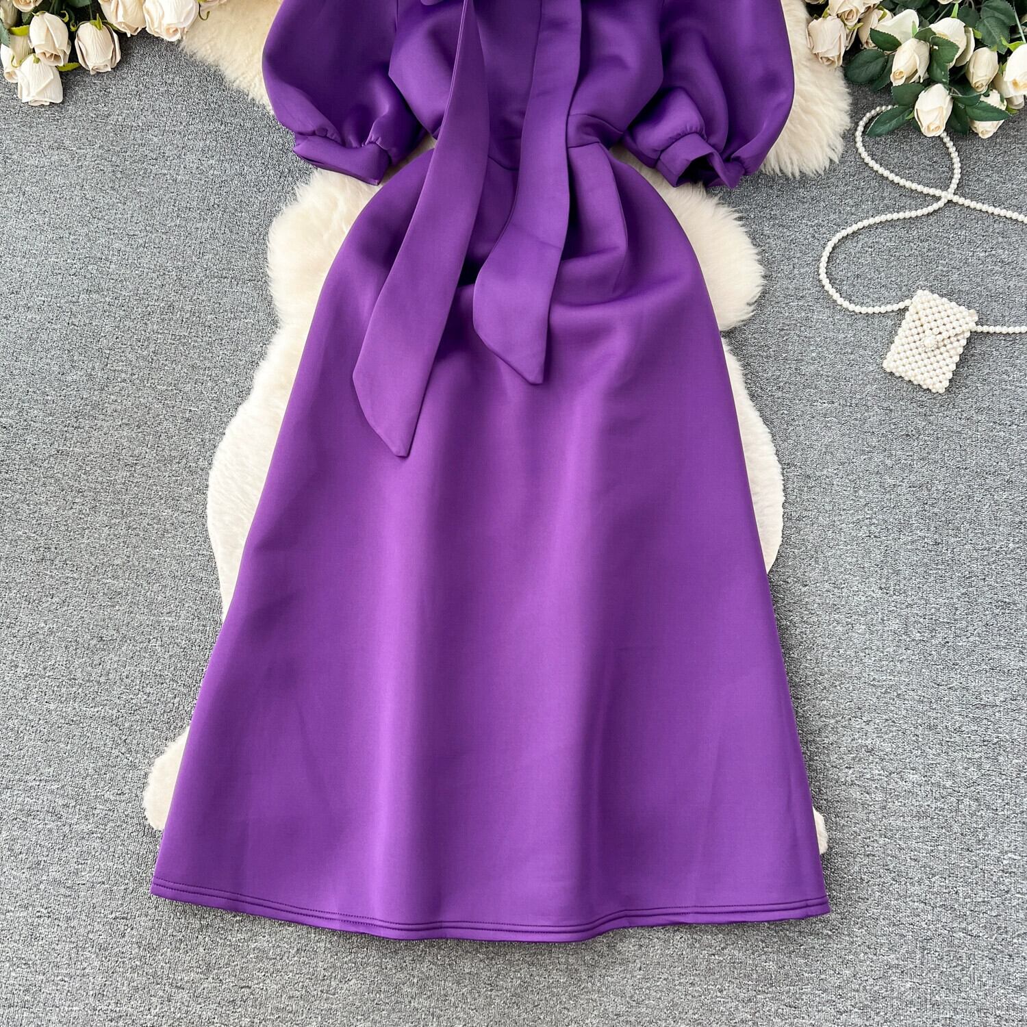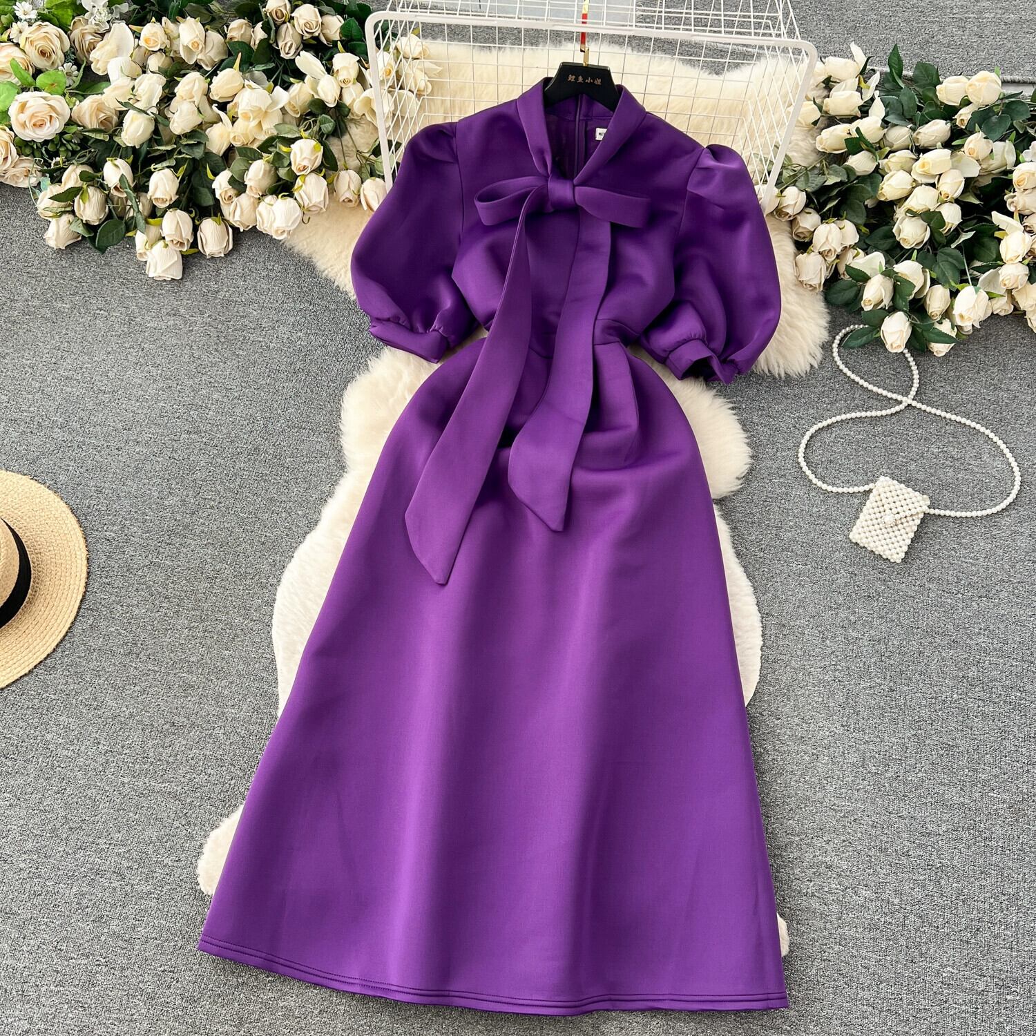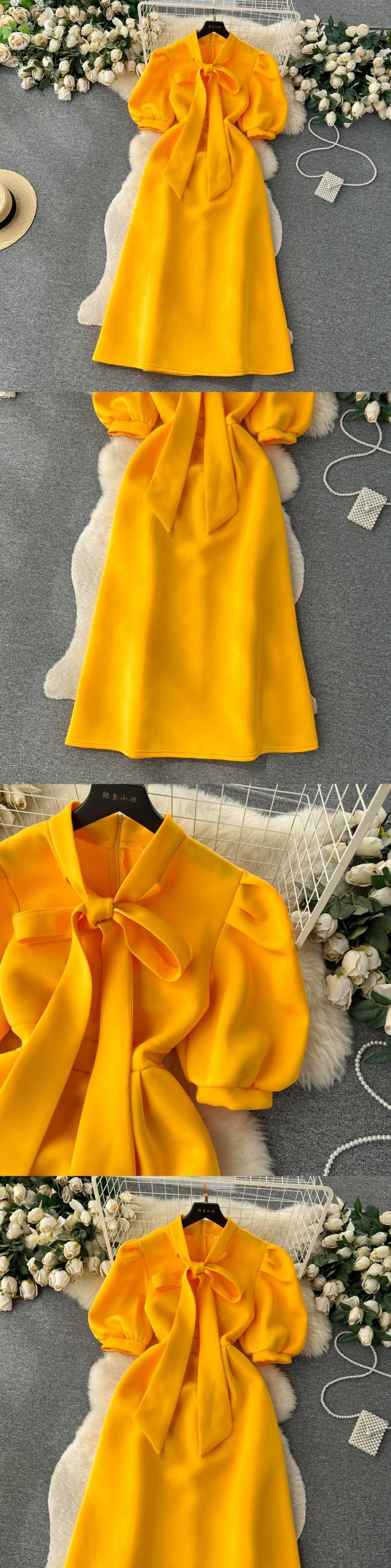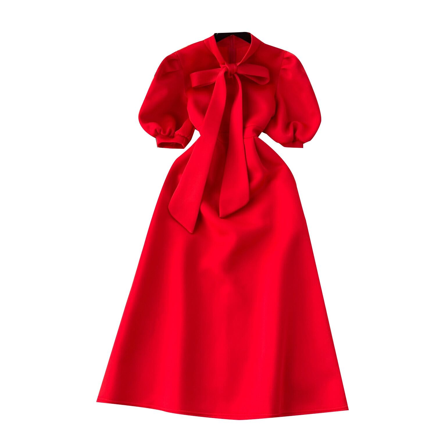 ヨーロッパとアメリカのライト高級レトロ蝶ネクタイパフスリーブドレスドレス女性のハイウエスト痩身気質ロングスカート ハイウェスト リボン ヨーロピアン lyxaj99110264761
