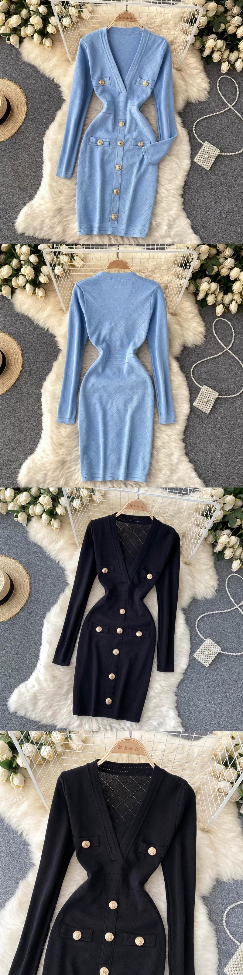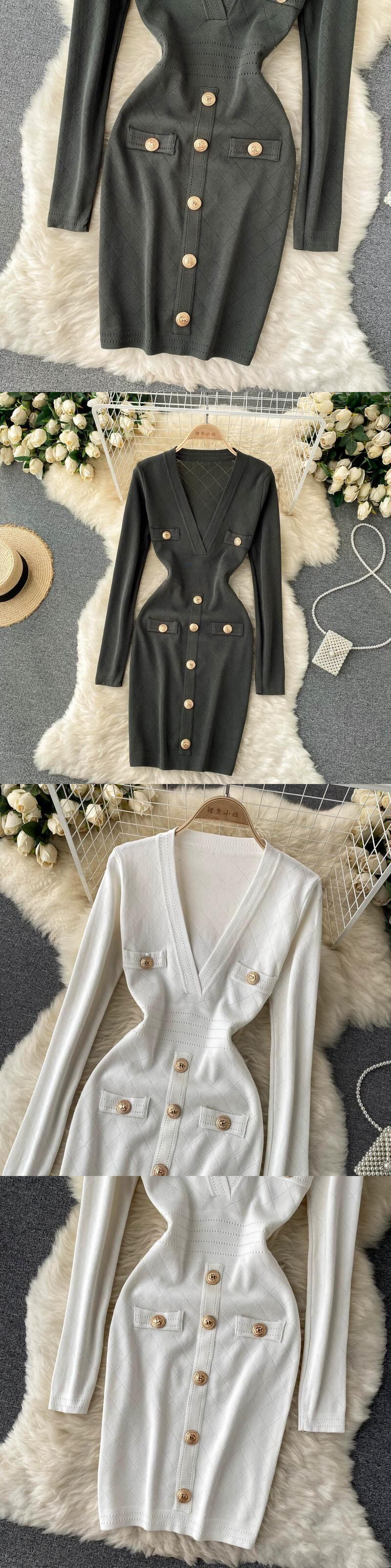 軽くて大人なスタイルのドレス、人気のトレンドのひし形パターン、深い V ネック、ボタンダウン、スリムフィットのセクシーなヒップ抱きのショート スカート Vネック lyxaj10817754505