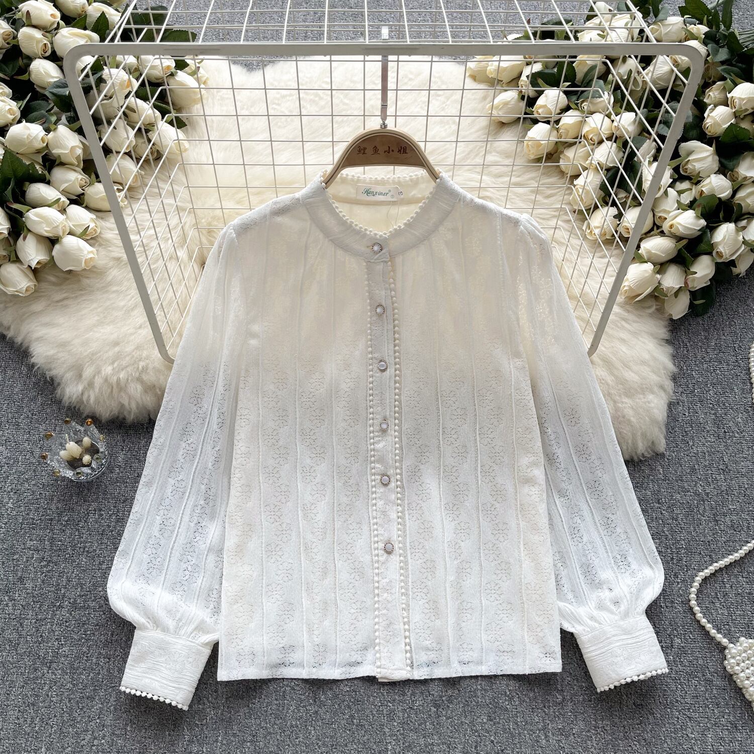 レースボトリングシャツ女性の秋 2023 新しい気質小さなスタンドアップカラーシャツ多用途年齢を減らすパフスリーブトップ女性 オータム 秋物 lyxaj10358226329
