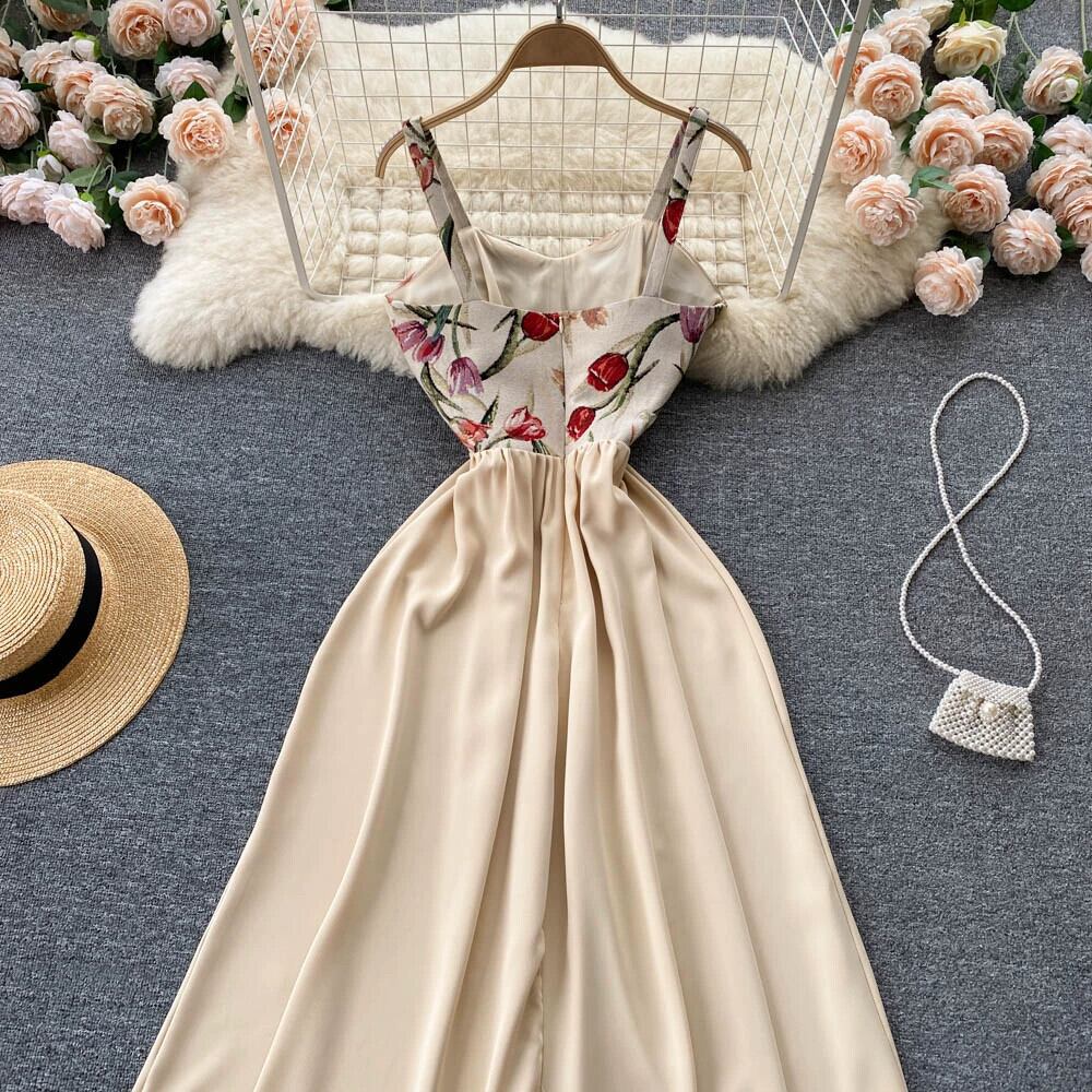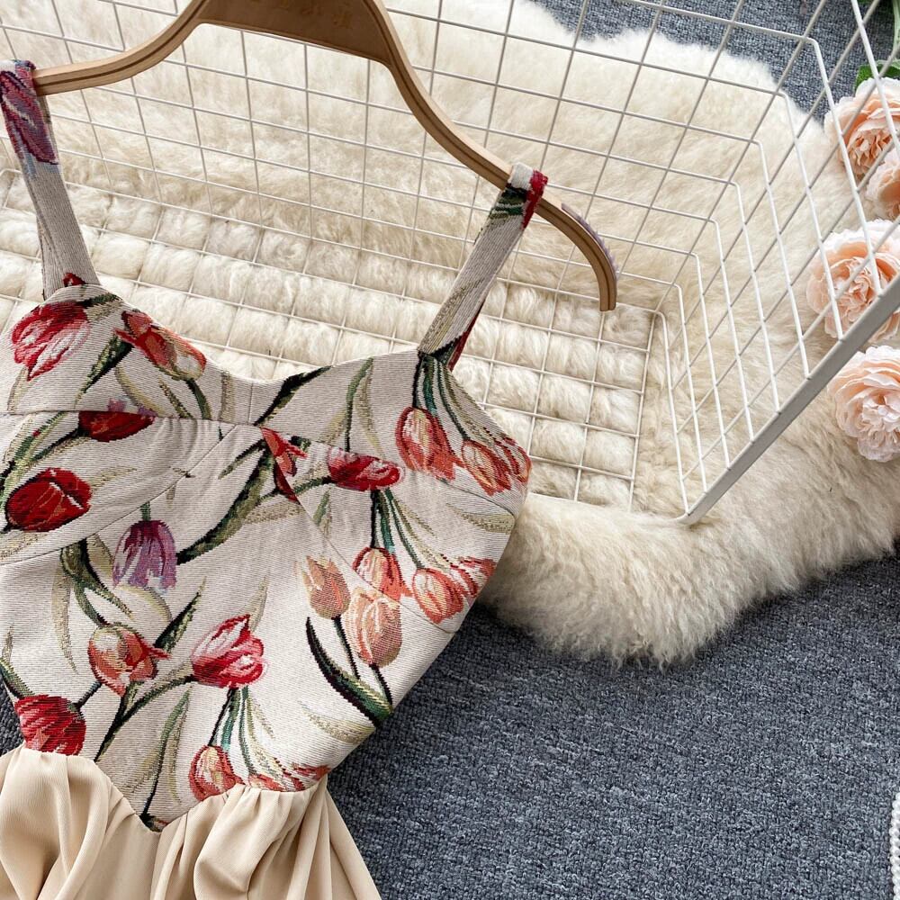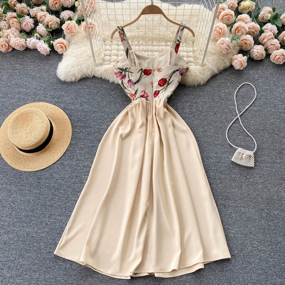 フレンチドレス ヘップバーン風 痩身ボトミング 花柄サスペンダースカート 初恋レトロ スーパーフェアリー 優しいミドル丈スカート lyxaj58536004859