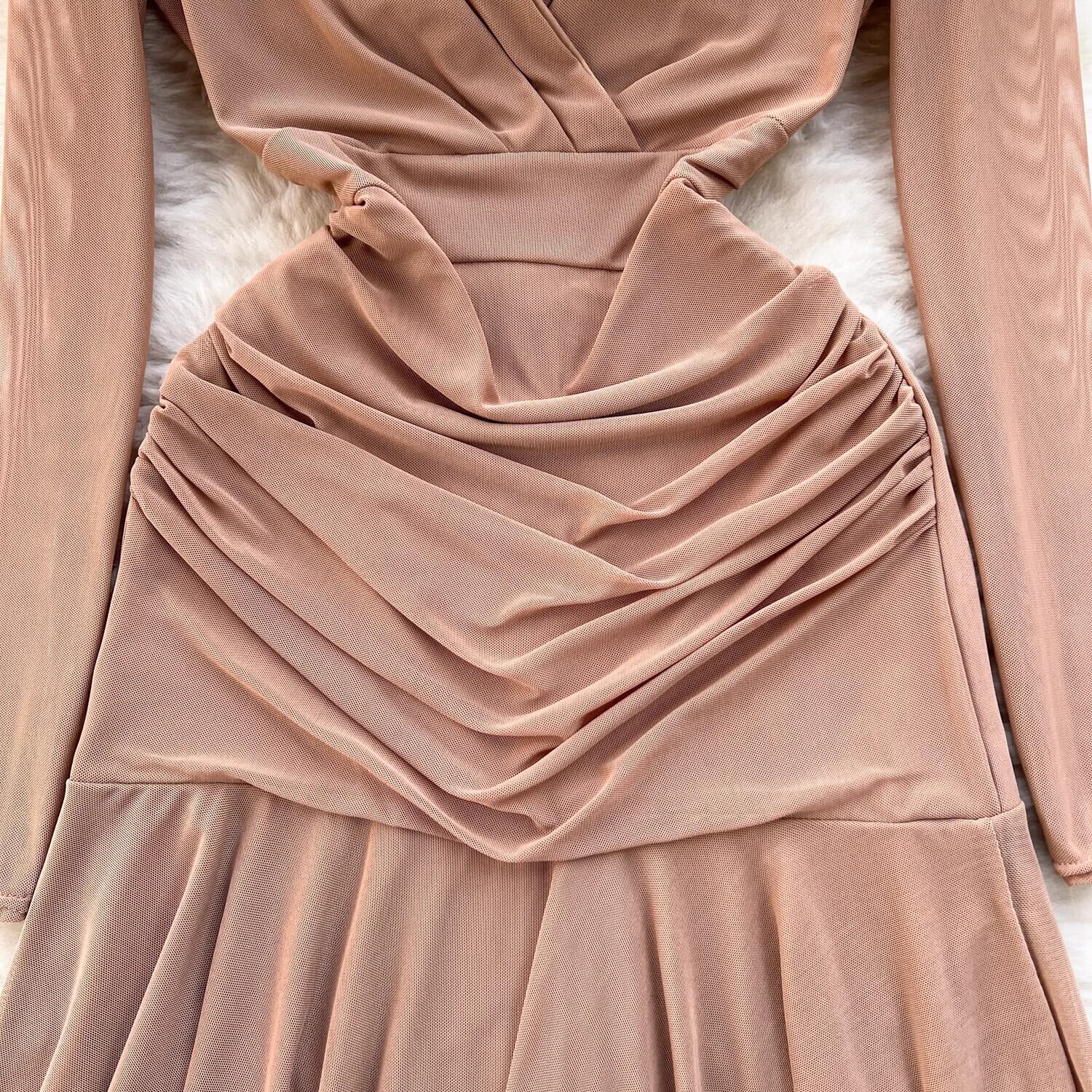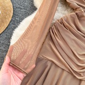 軽くて洗練された女性の気質ドレス春の女性のシースルーメッシュ長袖プリーツスリムフィットフリルスカート ロング スプリング 春物 lyxaj49059052603