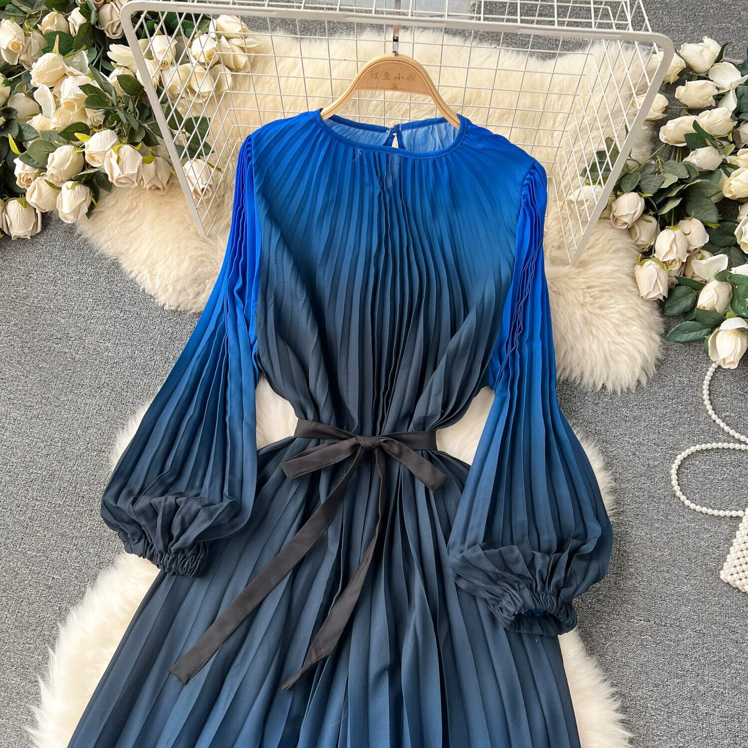 -エンド気質グラデーションドレスレディースニッチライト大人スタイルルーズラウンドネック長袖プリーツスカートドレープロングスカート Oネック lyxaj30387229685