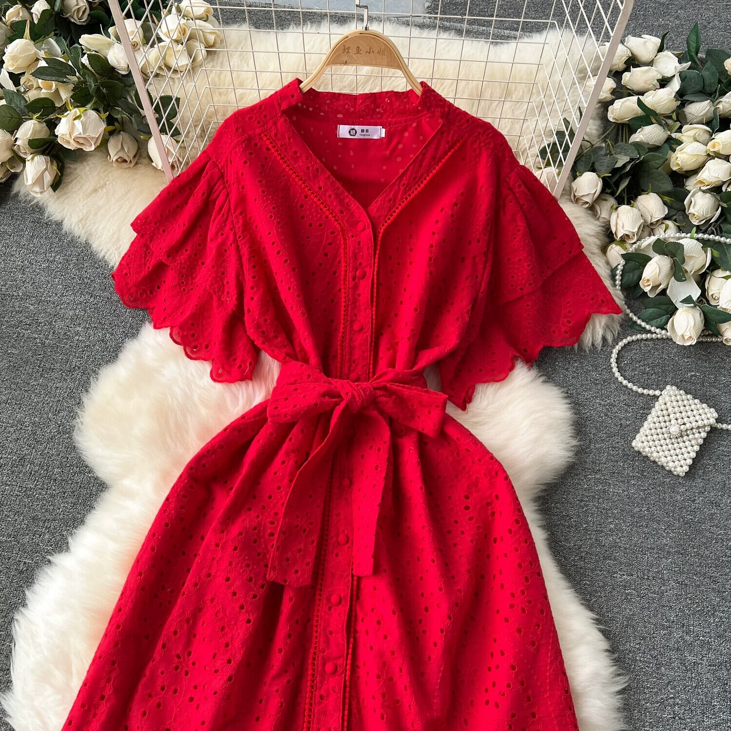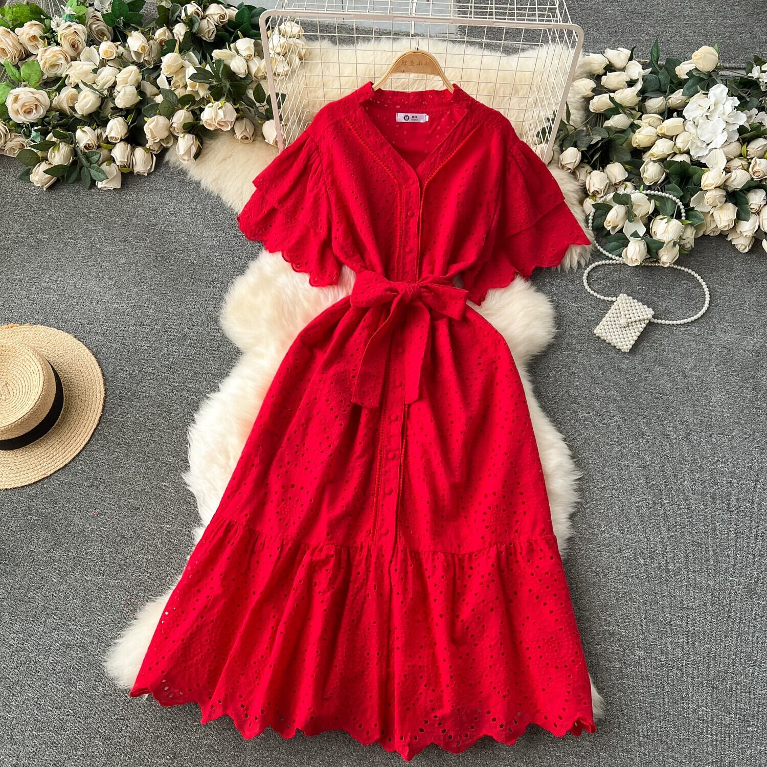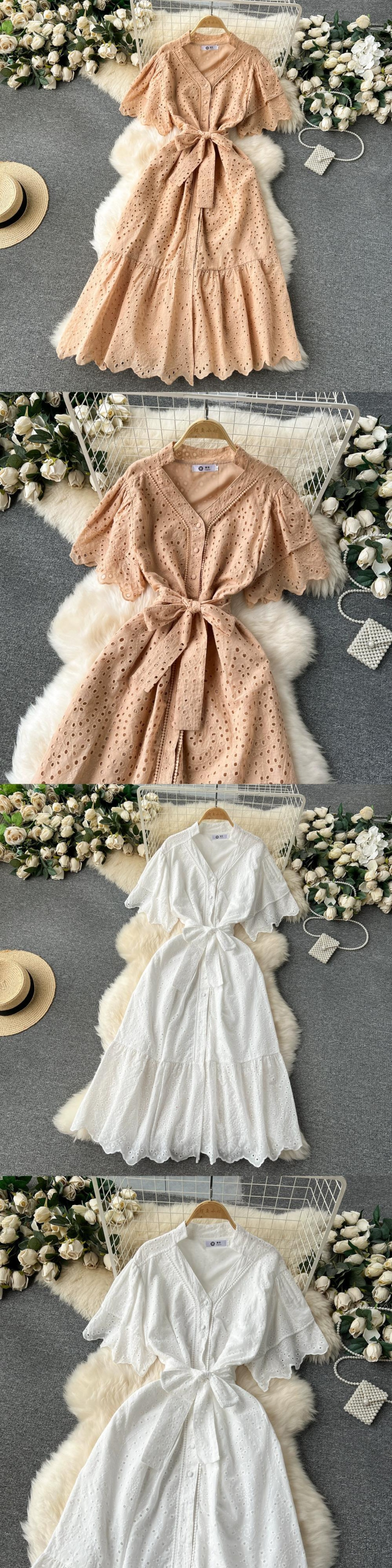 2024 重工業刺繍中空空気 V ネックブレストスリムフィットミッドレングスフリルスカート半袖ドレス ショート ハーフスリーブ Vネック lyxaj95736048411