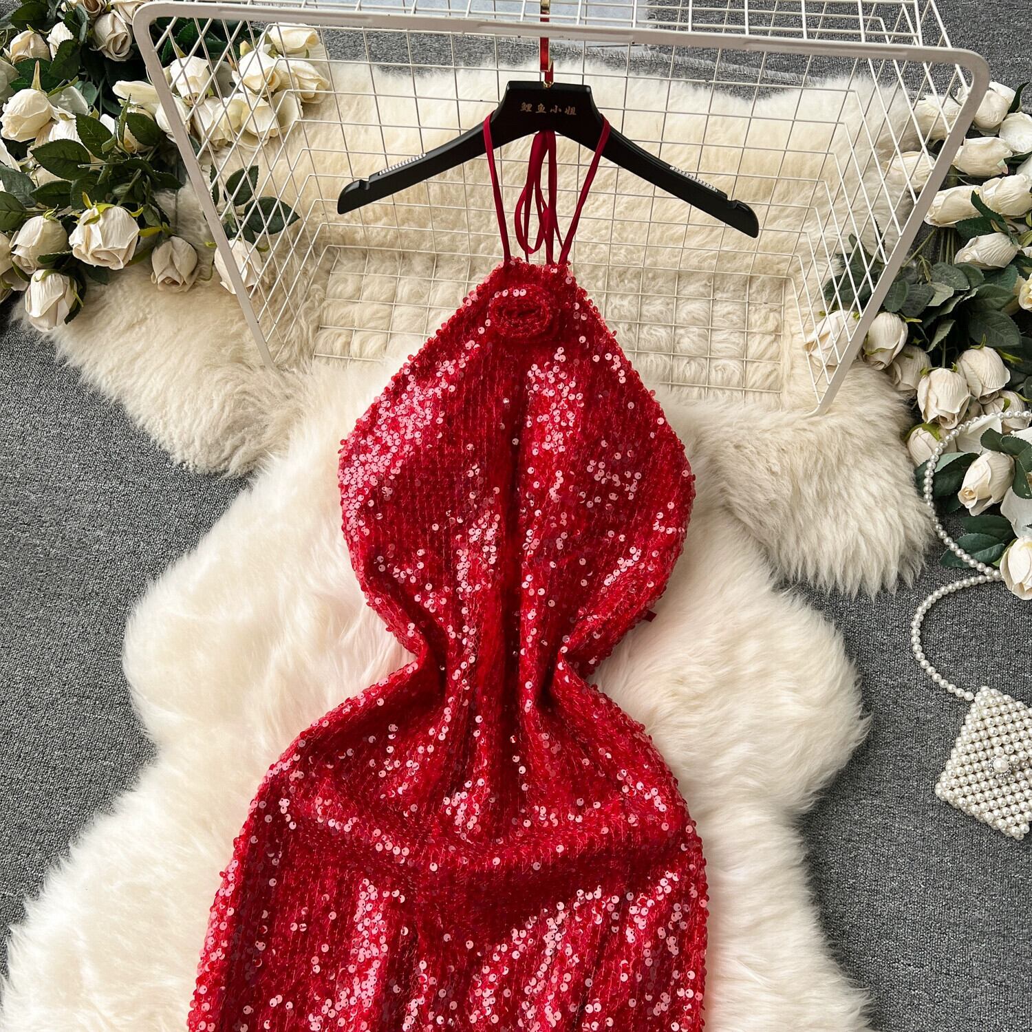 -エンドスパンコールドレス、ハイエンドライトラグジュアリー、ニッチ社交家スタイルのホルターネックドレス、女神ファンの策略スリットスカート lyxaj38070009450