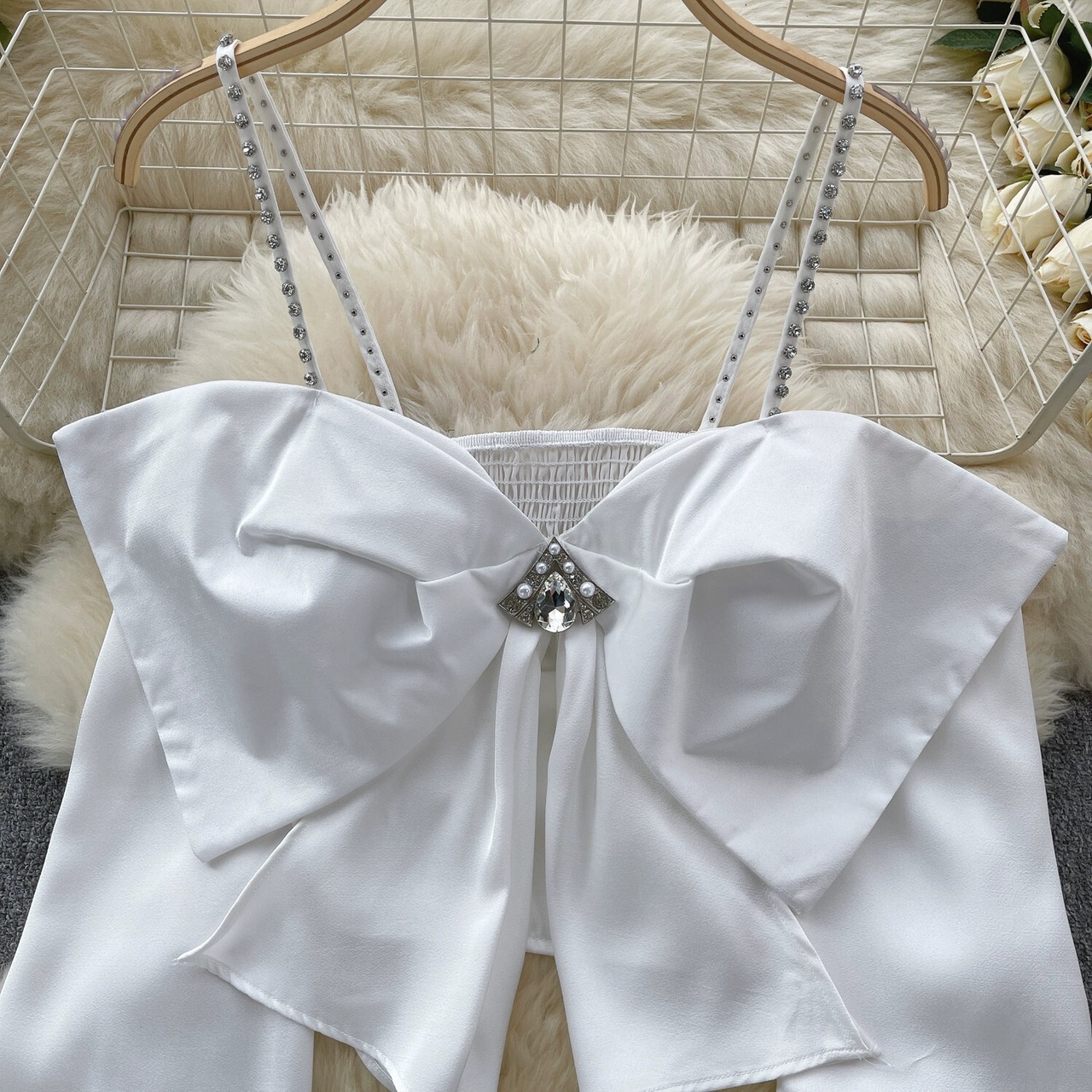 ヨーロッパの宮殿スタイルのシャツの女性のハイエンドライト高級ダイヤモンドサスペンダーセクシーなオフショルダーデザインの弓ショートトップ リボン レース ヨーロピアン lyxaj61920060338