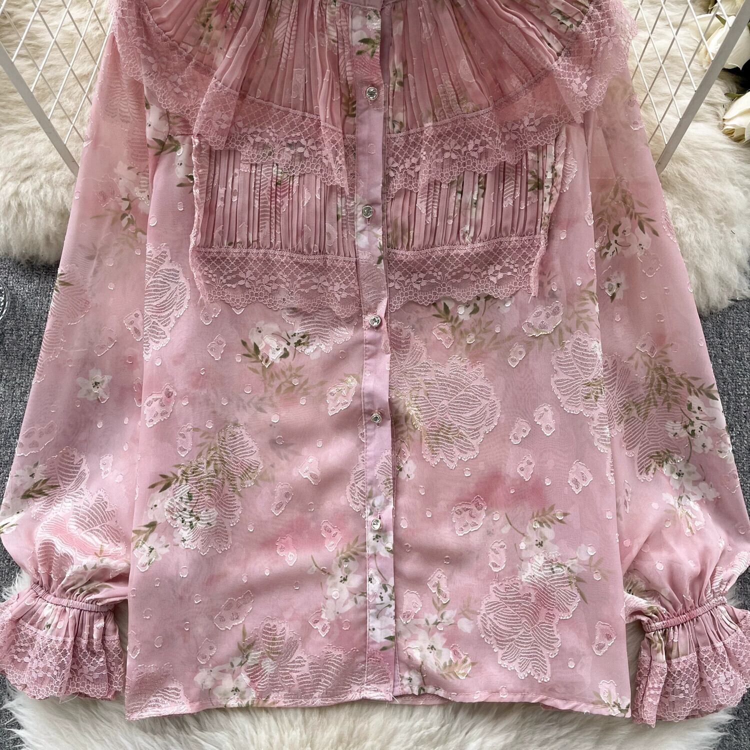 2024 早春の新作シフォンシャツ女性甘いレースプリーツスタンドカラーフレンチパフスリーブ長袖トップ ロング 大人ガーリー スウィート キュート カジュアル スプリング 春物 lyxaj7110025014
