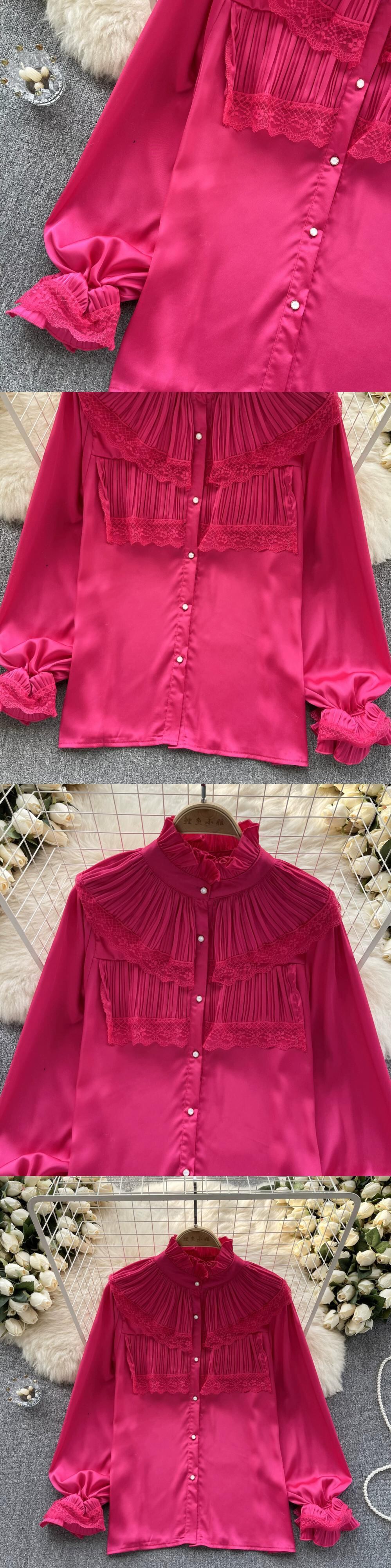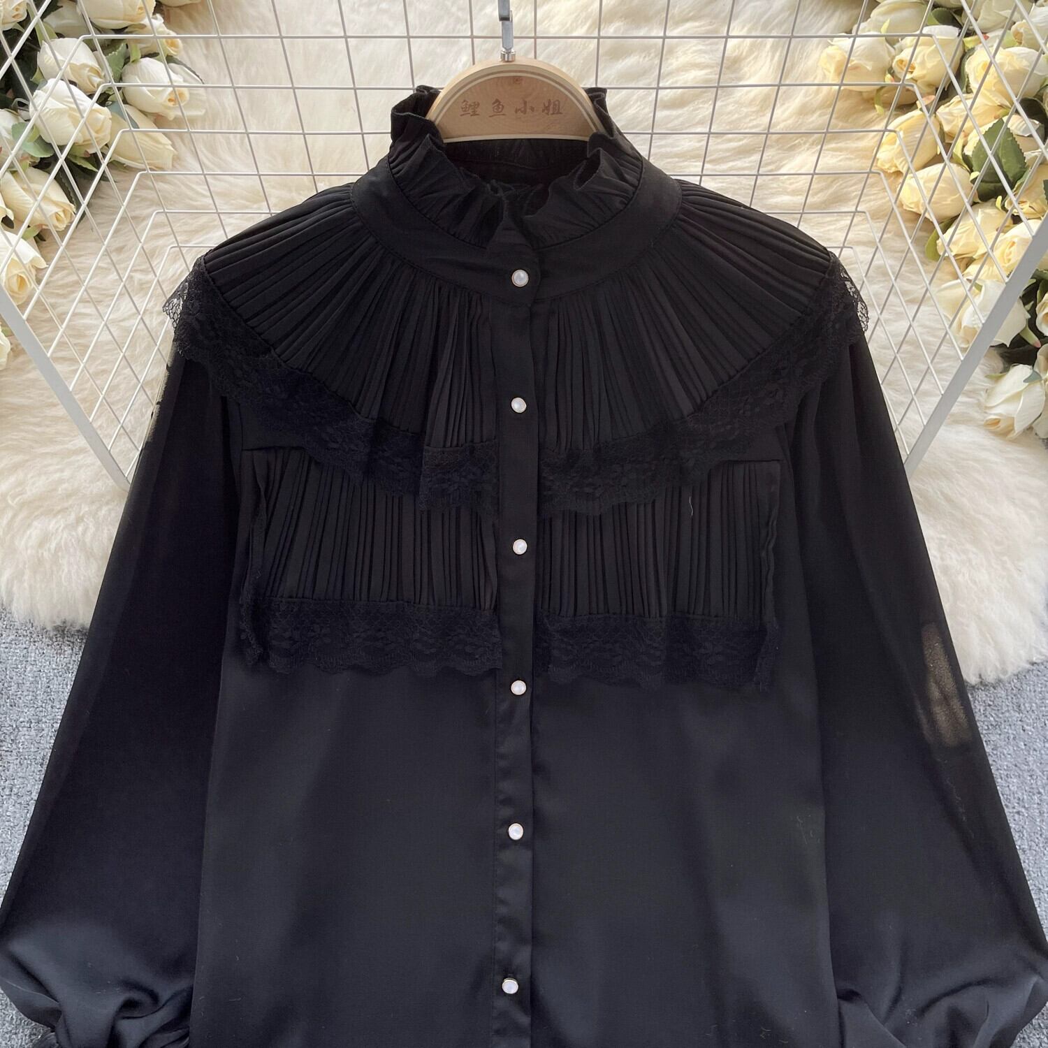 メイラード高級シャツ、丈夫なプリーツイヤリング、スタンドカラー、甘いレース、パフスリーブトップシャツ 大人ガーリー スウィート キュート カジュアル 指輪 lyxaj5340277244