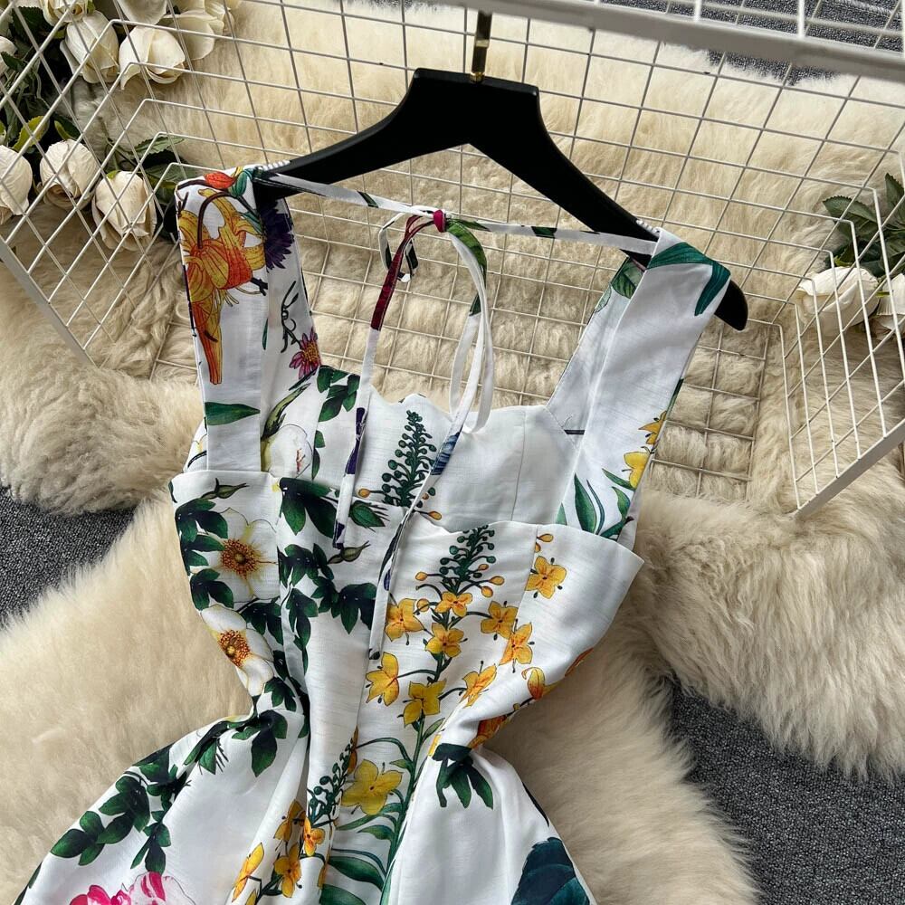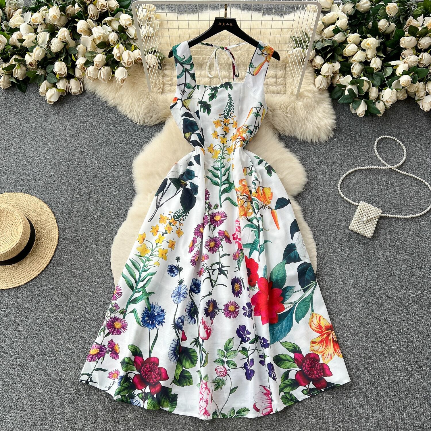 ウエストバンド付きのヨーロッパとアメリカンスタイルのプリントスクエアネックドレスレディース夏、ニッチ、シック、フレンチスタイル、ハイエンドの気質スカート サマー 夏物 スクウェア ヨーロピアン lyxaj94147841639