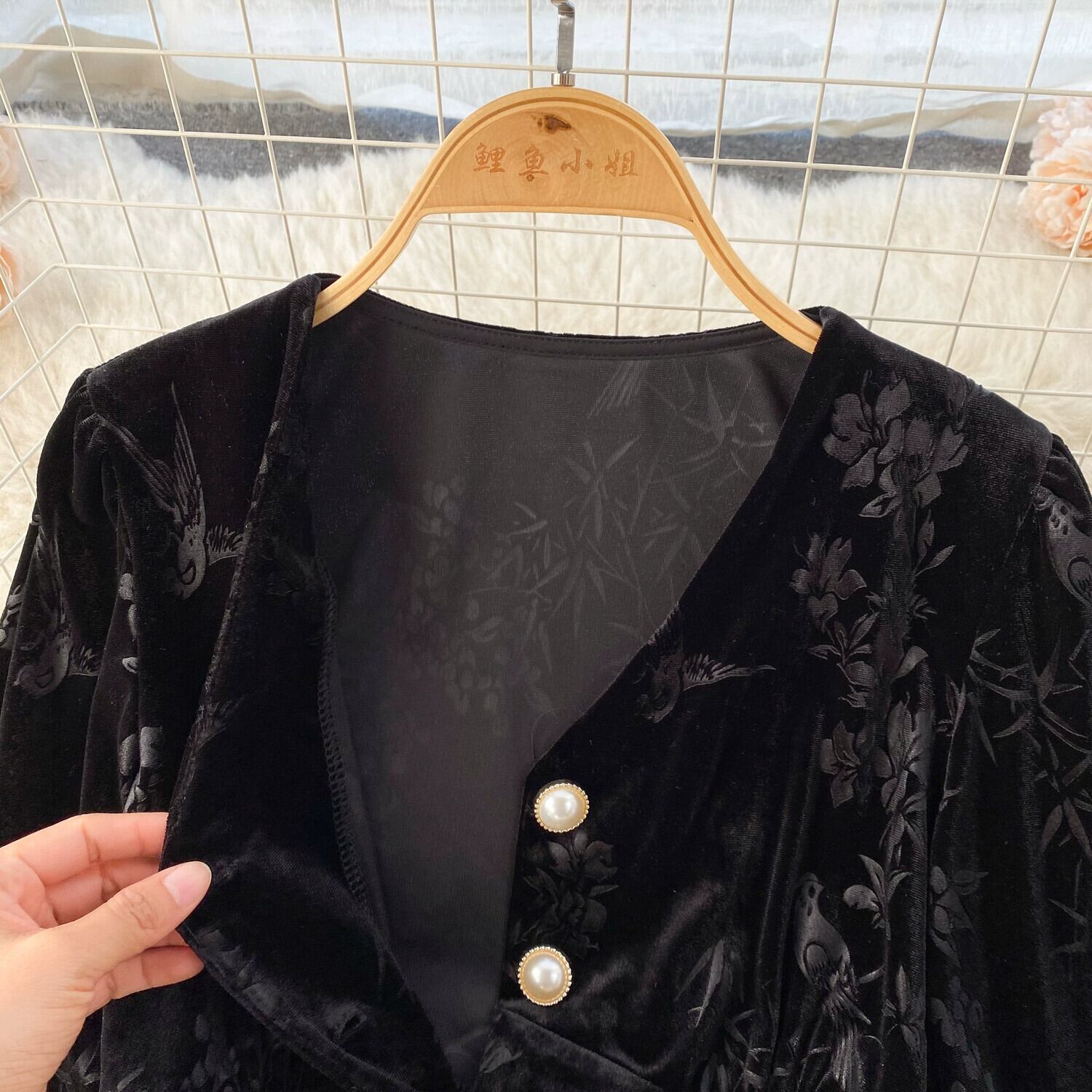 - レトロなベルベットのスーツの女性、年齢を軽減するパフスリーブのトップ、多用途のミドル丈のスカート、気質のある 2 点セット lyxaj91325152374
