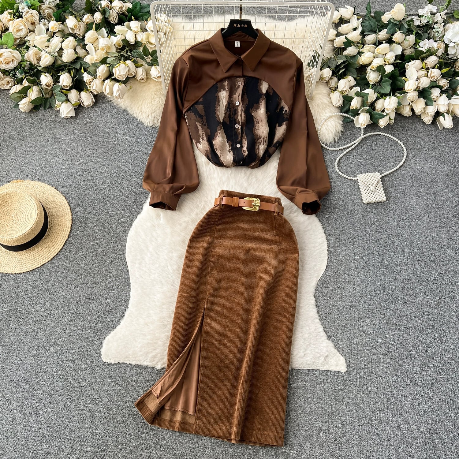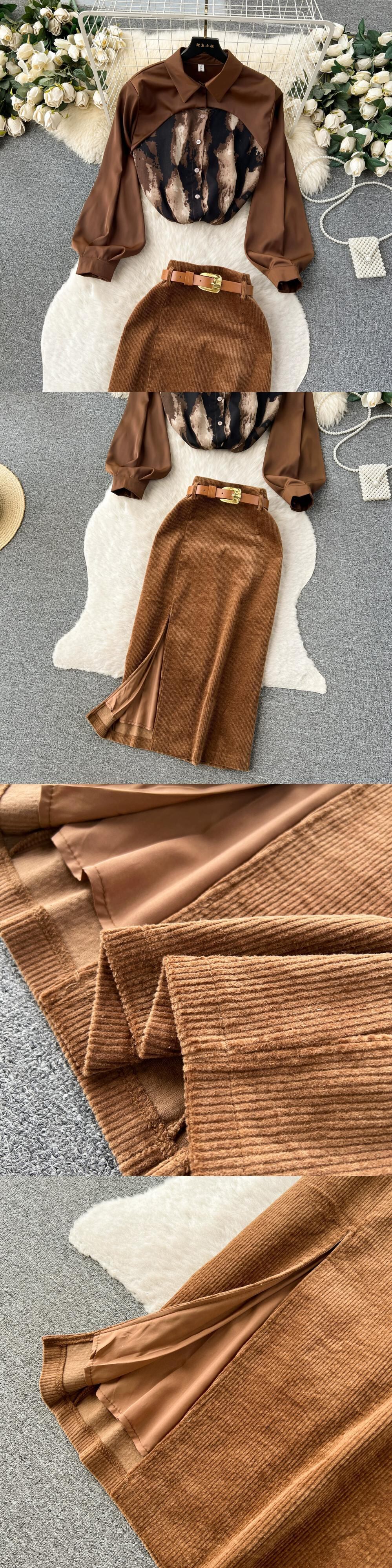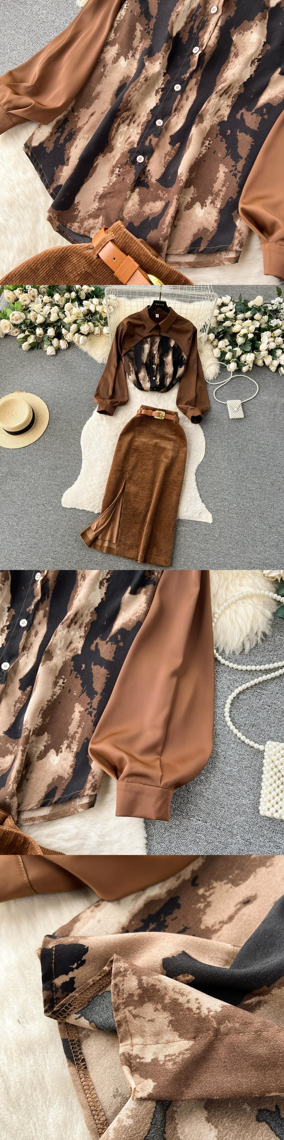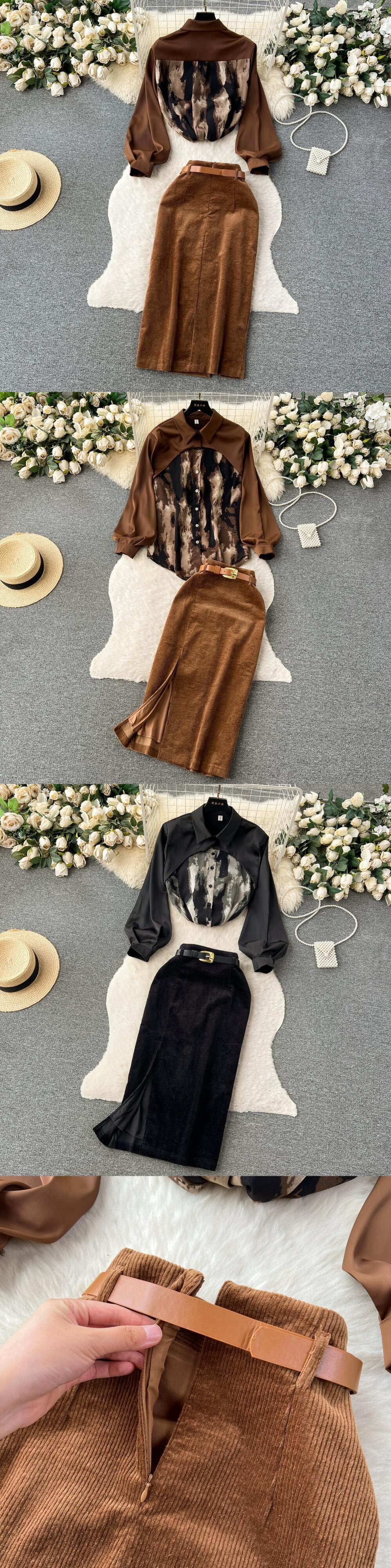 秋冬ライト高級レトロシンプルスタイル絞り染めパッチワークシャツトップ+ハイウエストスリムスカート2点セットレディース オータム 秋物 ウィンター 冬物 lyxaj55472930816