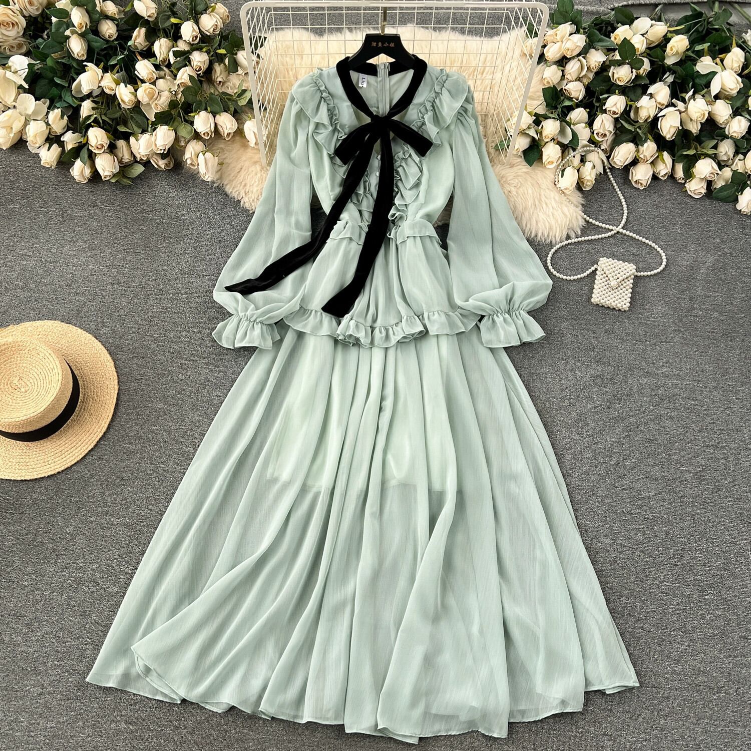 ティーブレイクフレンチドレス 2024 新しい女性の春と秋の甘いフリルスリムロングコントラストシフォンホリデードレス 大人ガーリー スウィート キュート カジュアル スプリング 春物 オータム 秋物 lyxaj93510097874