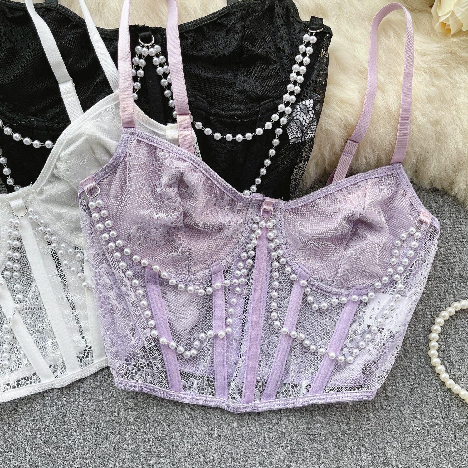 甘いレースキャミソールレディースデザインビーズチェーンスリムショートコルセットおしゃれ万能クロップトップ 大人ガーリー スウィート キュート カジュアル lyxaj17130799316
