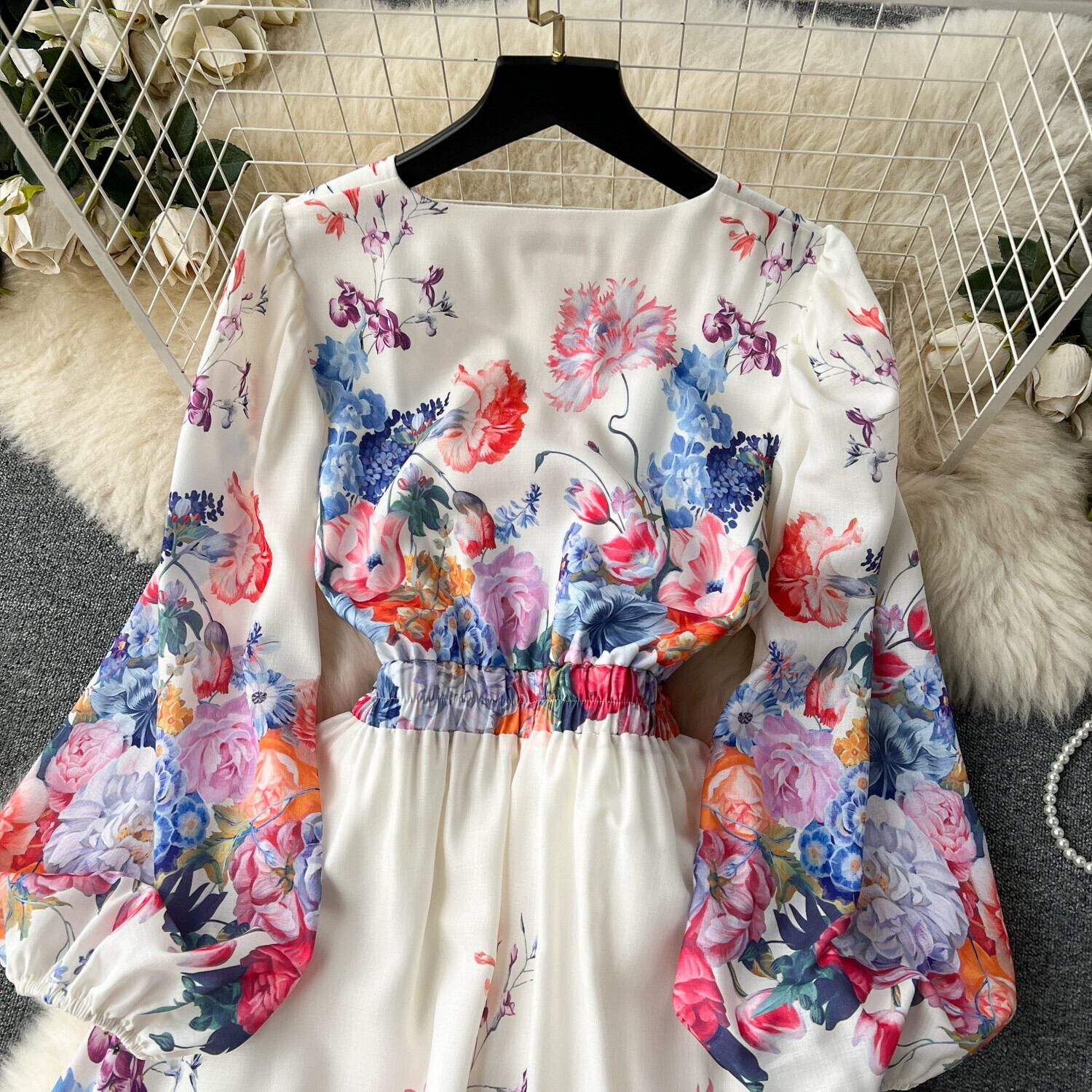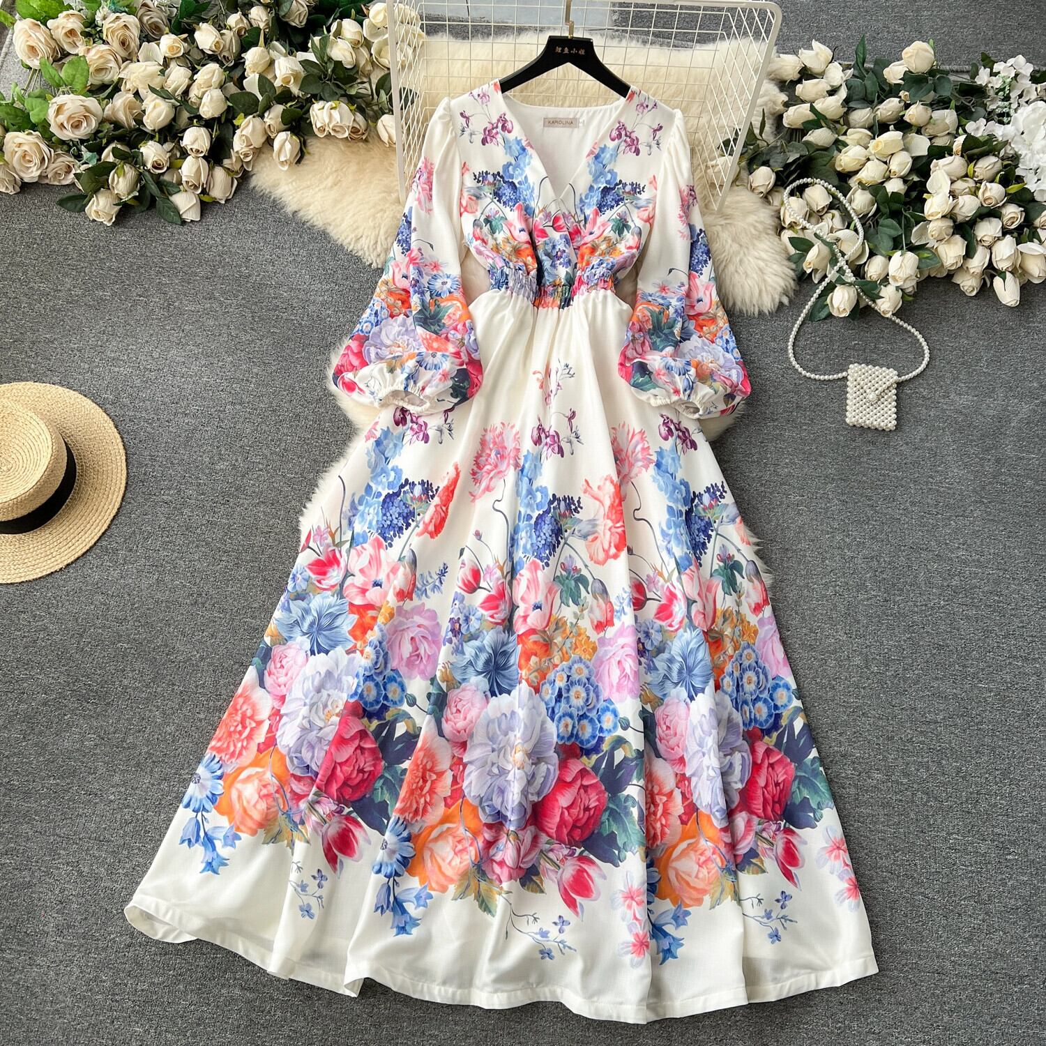 花レトロ宮殿スタイルドレス気質 V ネックウエストスリムロングパフスリーブホリデードレス女性 レース Vネック lyxaj32318789300