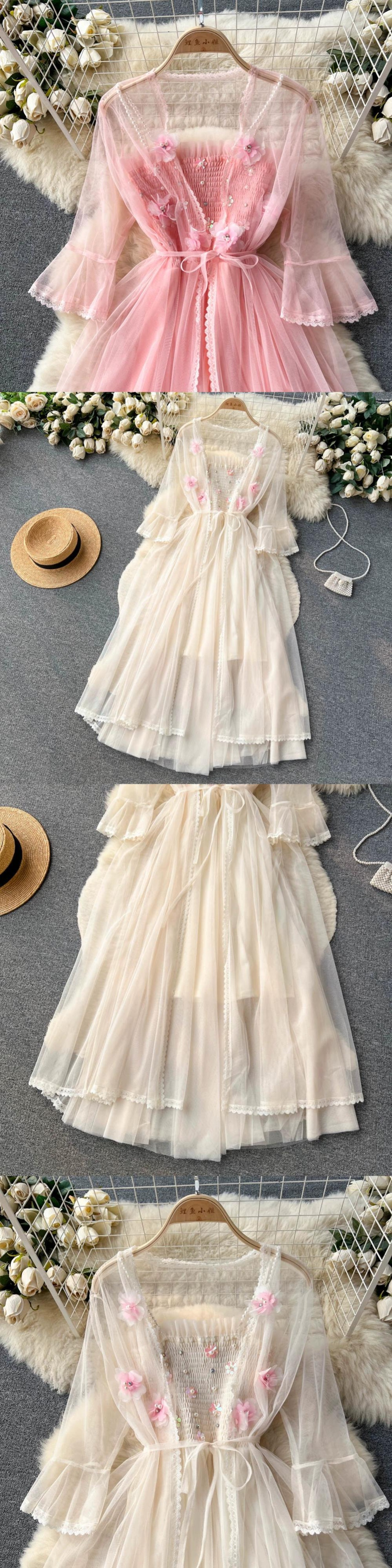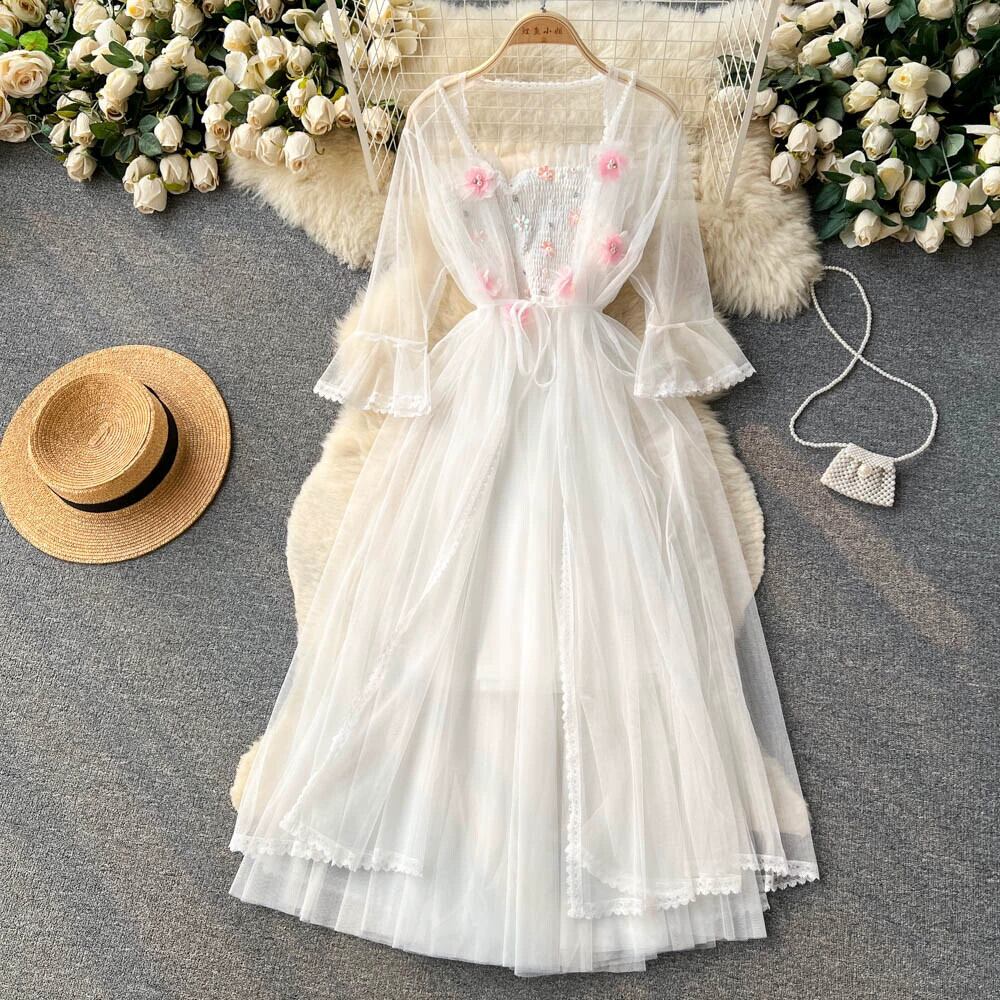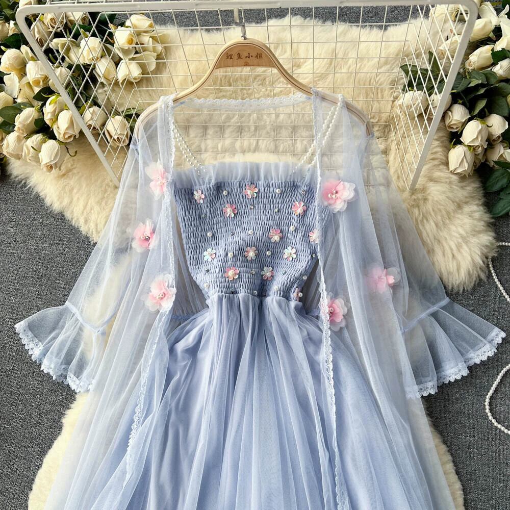 フランスのスーパーフェアリーメッシュサスペンダードレスツーピースセット女性の夏の立体花ミッドレングス日焼け防止カーディガンスーツ サマー 夏物 フラワーデザイン lyxaj95890031984