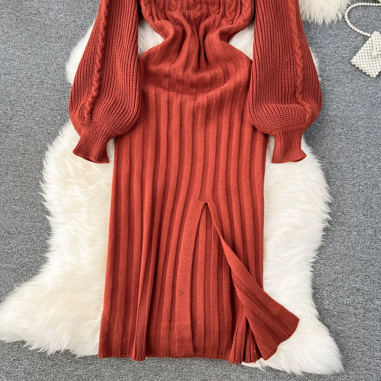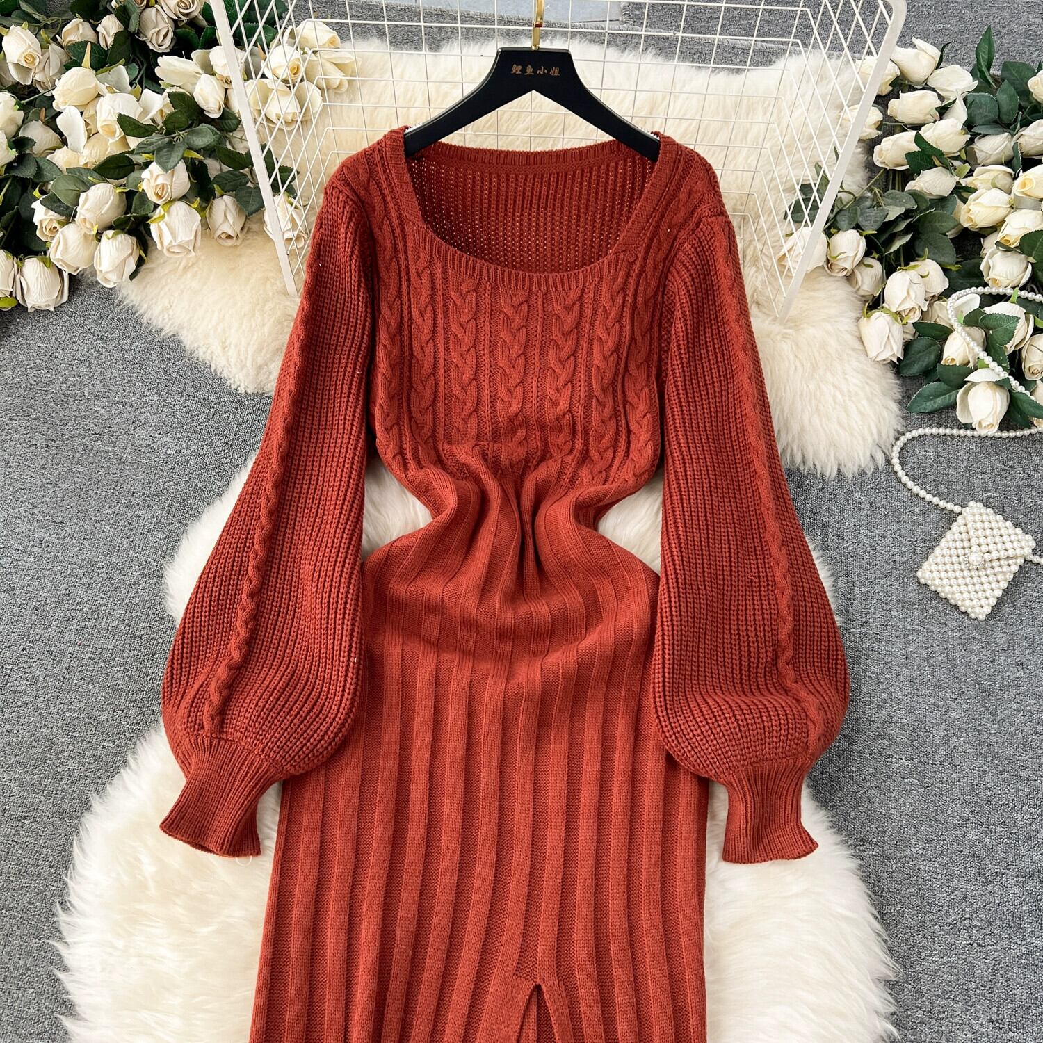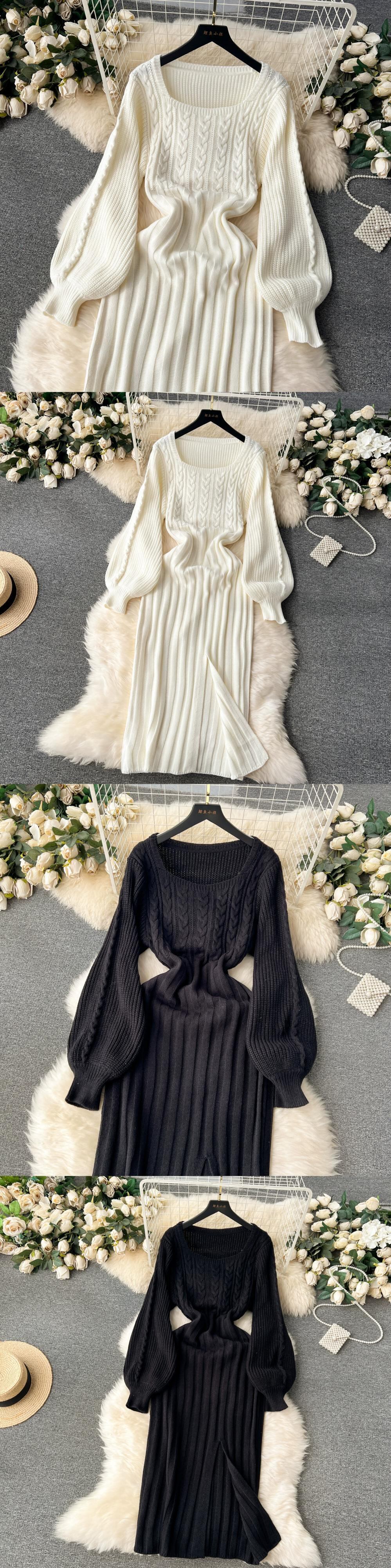 セータードレス レディース 秋と冬 - スクエアネック パフスリーブ ウエストスリット ボトリングスカート フレンチニッチニットスカート オータム 秋物 ウィンター 冬物 スクウェア lyxaj82343342128