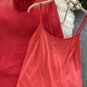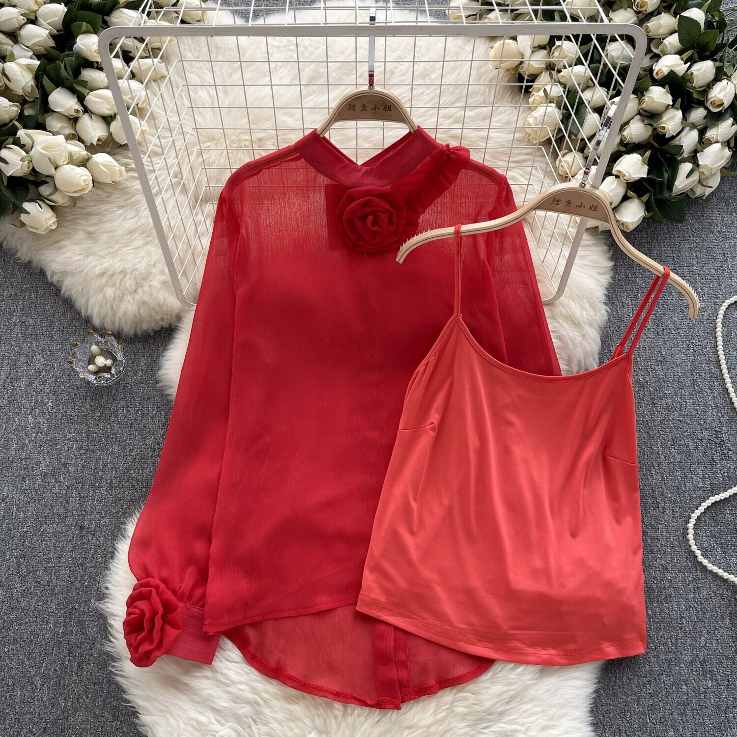 ライト高級立体花長袖シャツ女性秋の新作キャミソール薄い日焼け止めトップレイヤード 2 点セット ロング レッド オータム 秋物 フラワーデザイン lyxaj50173167116