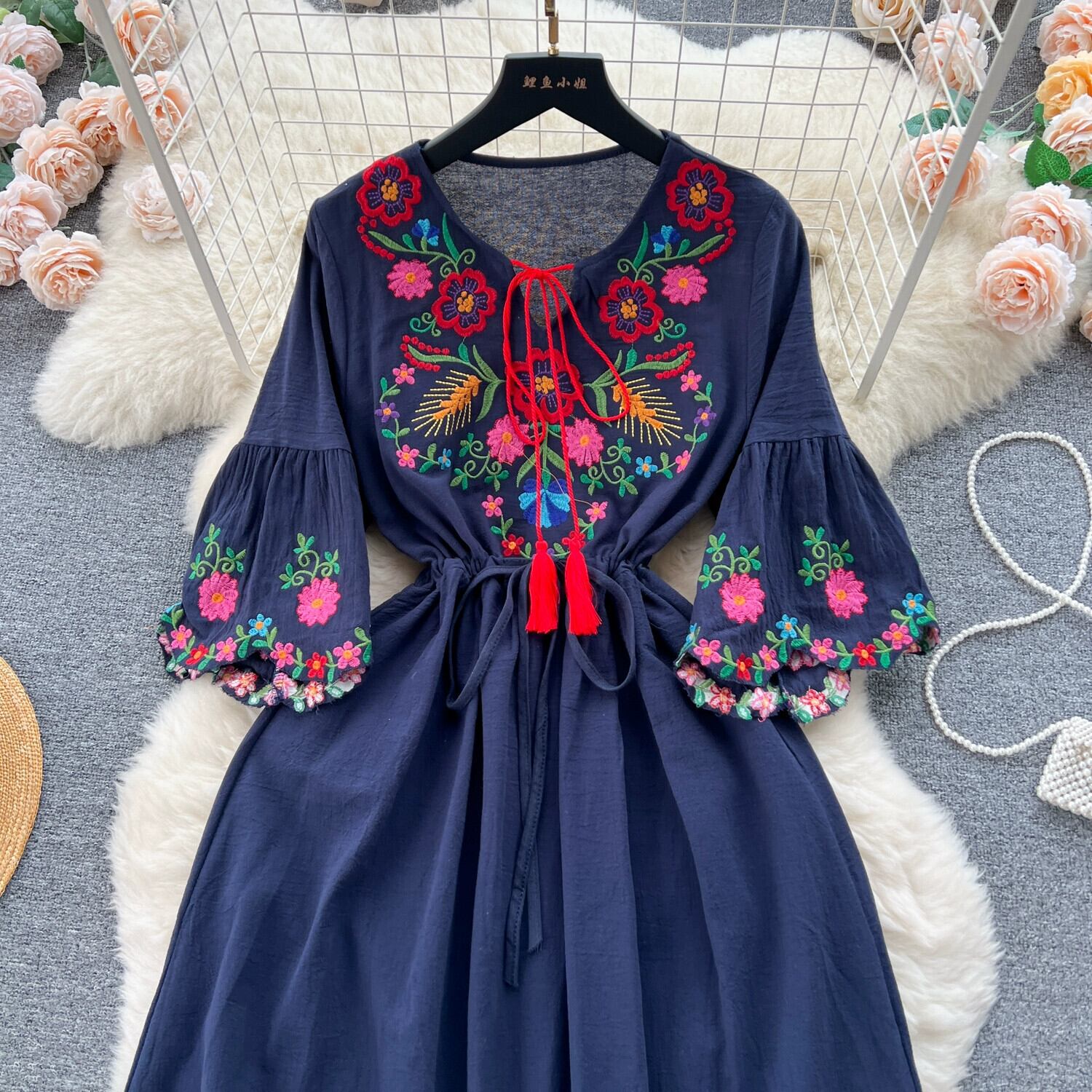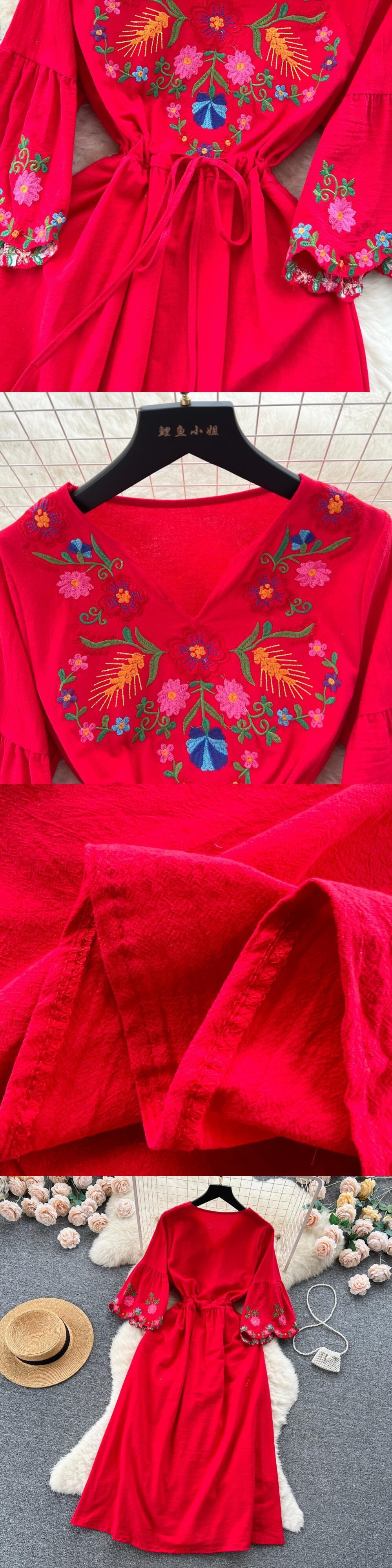 初秋ドレス女性の新しいニッチレトロエスニックスタイル重工業刺繍レースウエストベルスリーブ妖精スカート オータム 秋物 lyxaj51052374074