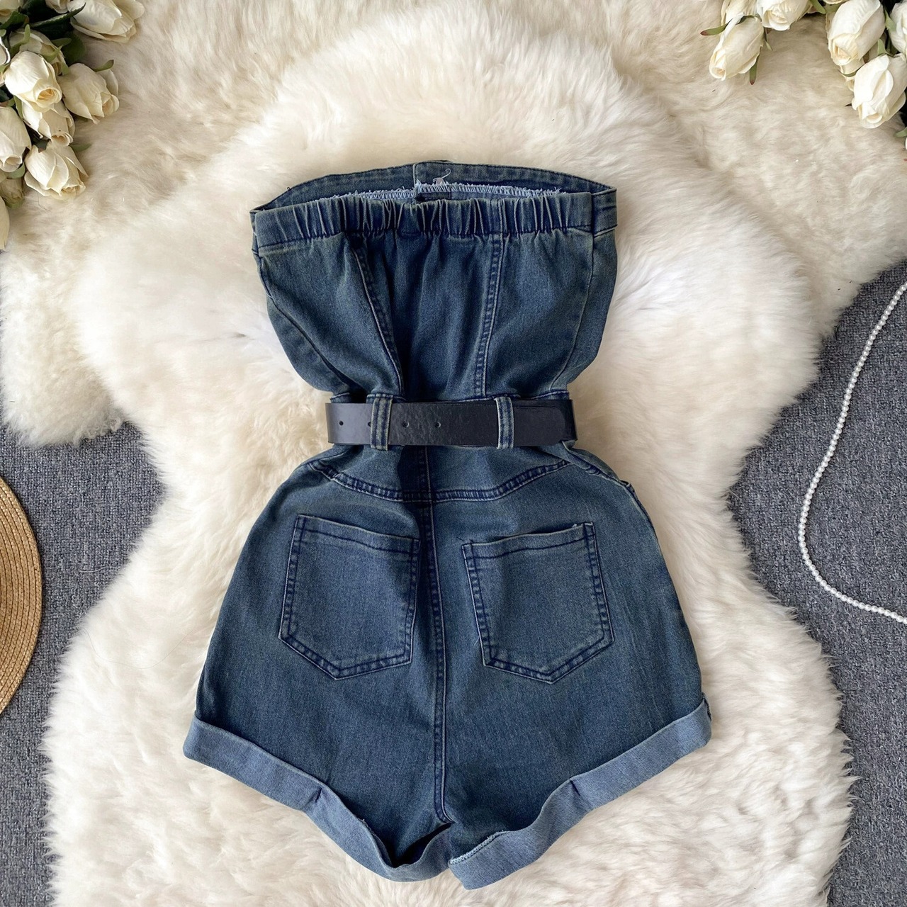 アメリカンレトロシックなネクタイチューブトップデニムジャンプスーツ女性夏ハイウエスト痩身ワイドレッグショーツ サマー 夏物 ブルマー lyxaj24676764601