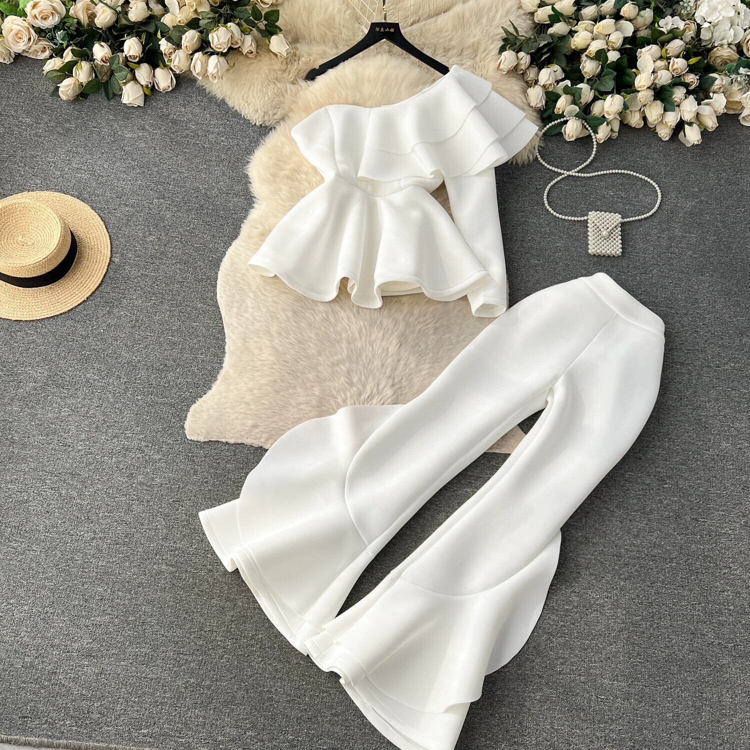 欧米の秋服、高級で凛としたエレガントなレディーススーツ、フリルトップス、万能ベルボトムの2点セット オータム 秋物 ヨーロピアン lyxaj2331186601
