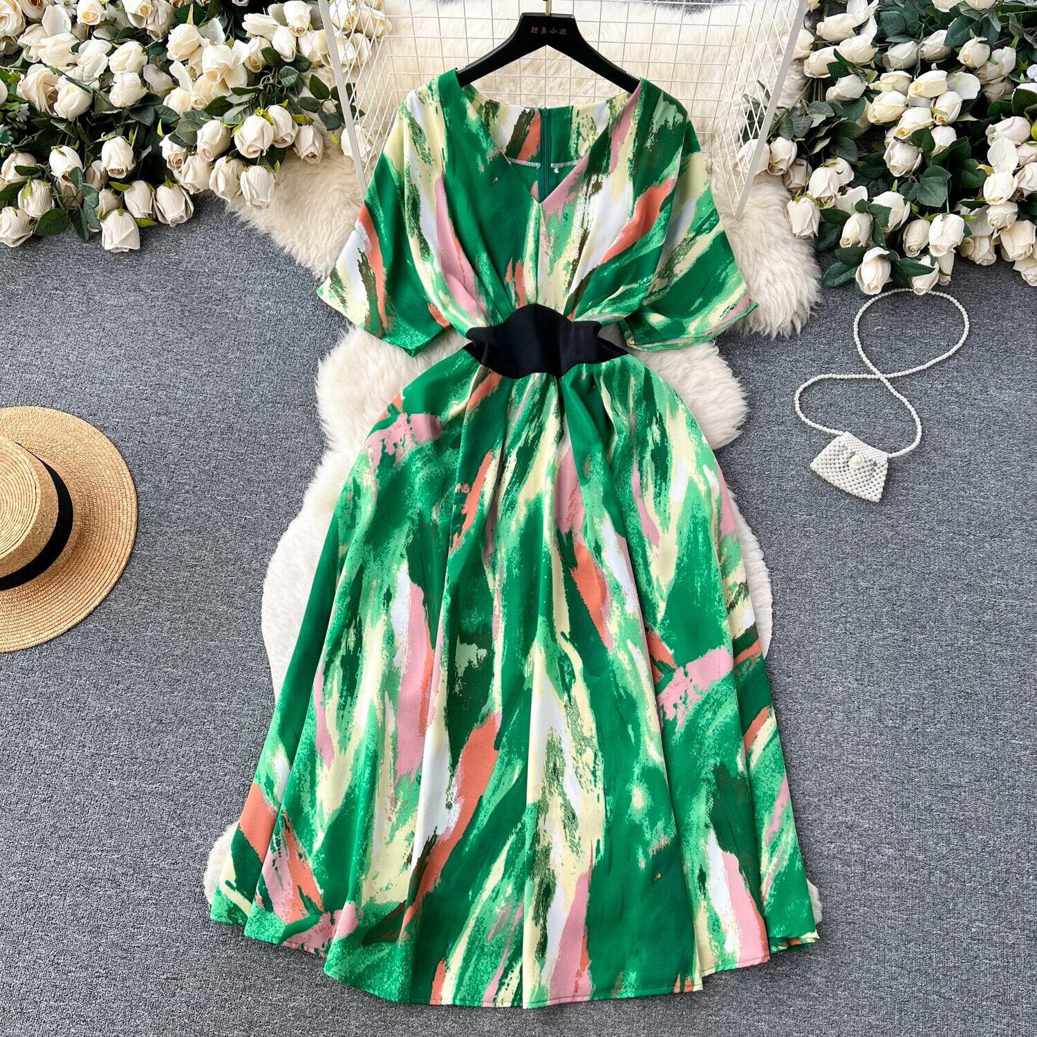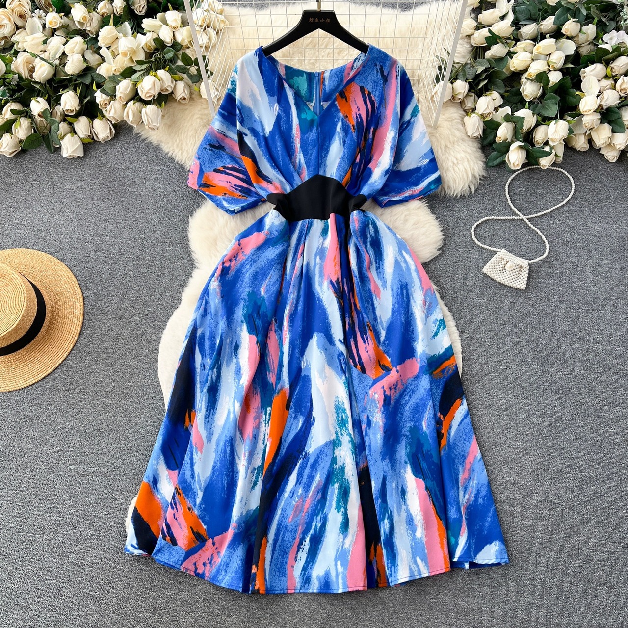 半袖ドレスの女性の夏の新しいスタイルのフランスのハイエンド V ネックウエスト痩身気質汚れたプリントスカート サマー 夏物 Vネック lyxaj19038716689