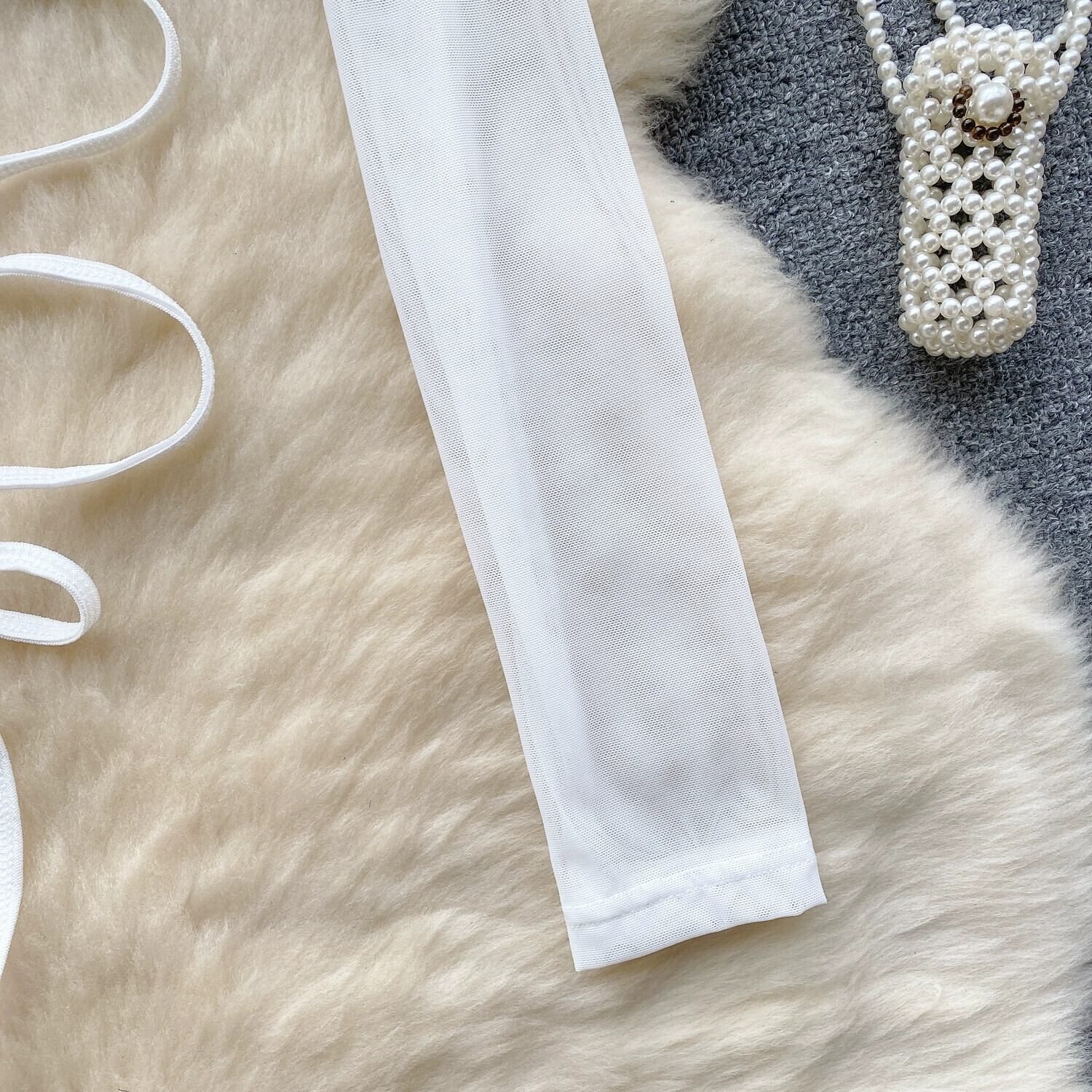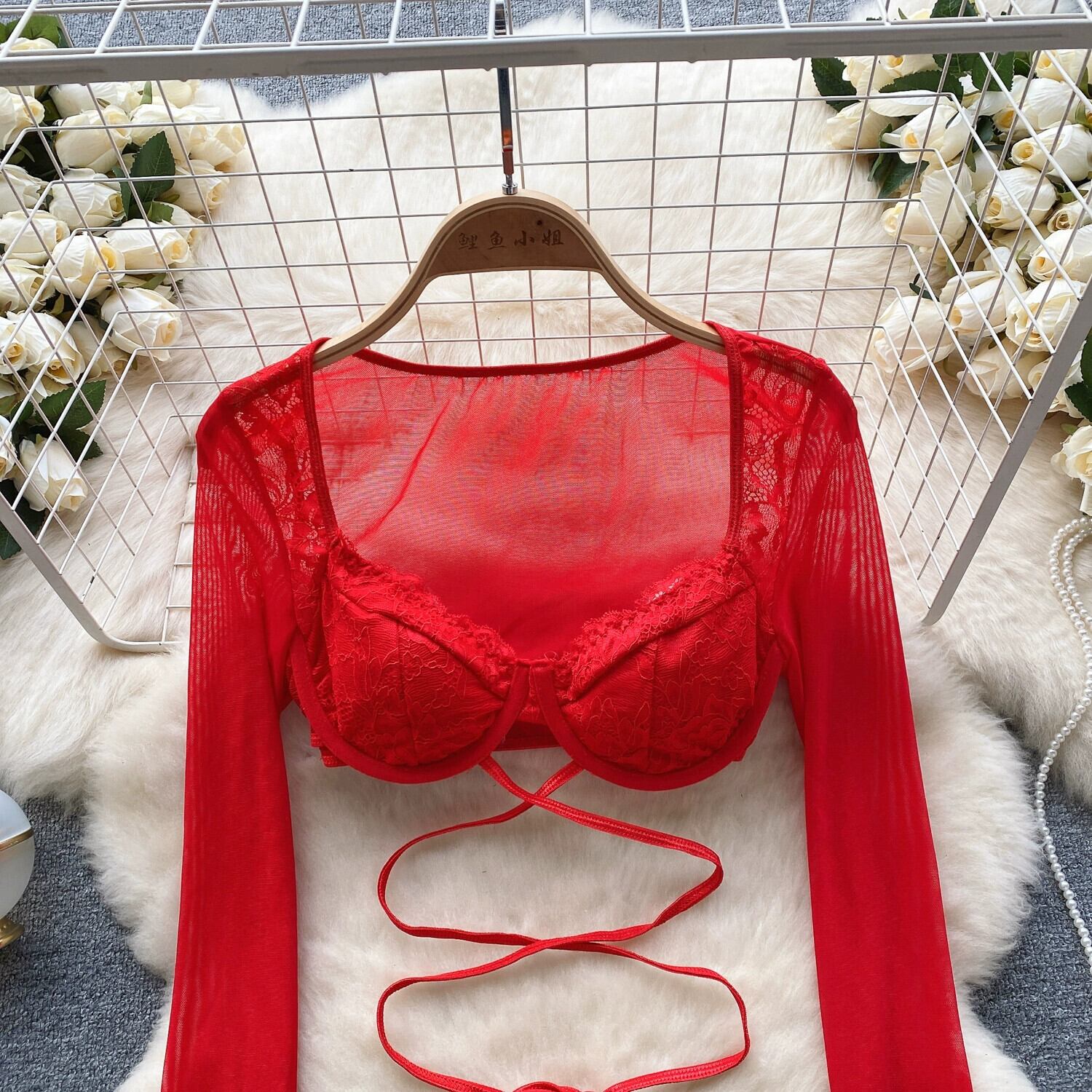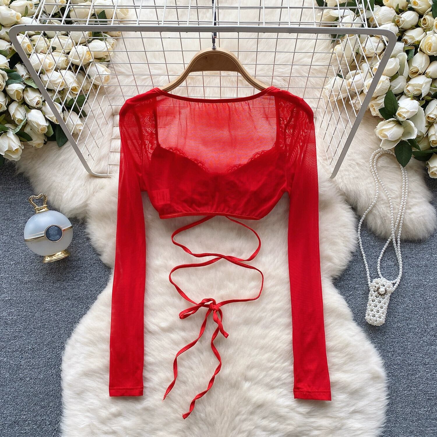 長袖へそ出しシースルーメッシュ Tシャツ女性ヨーロッパとアメリカのインとセクシーなショートクロスタイウエストレーストップ ロング ヨーロピアン lyxaj84640257823