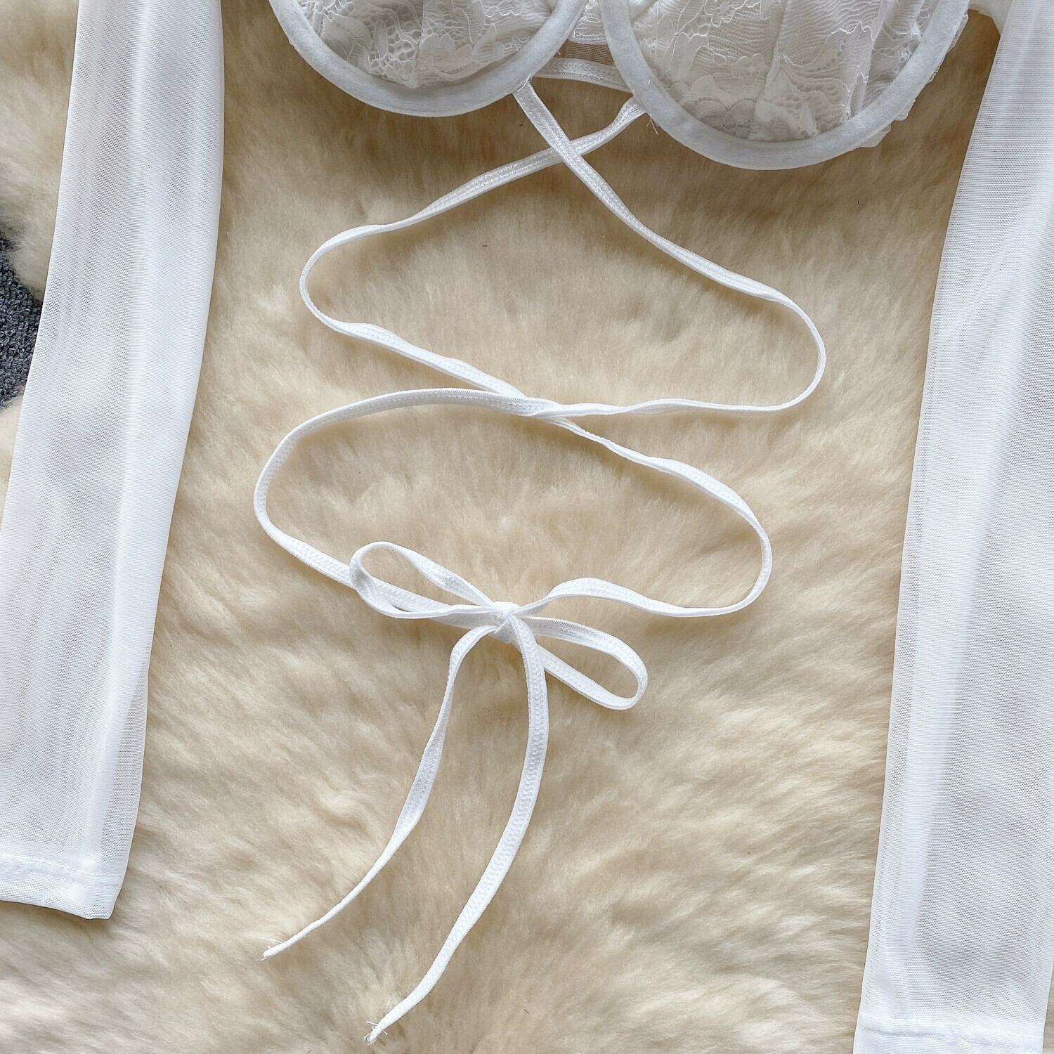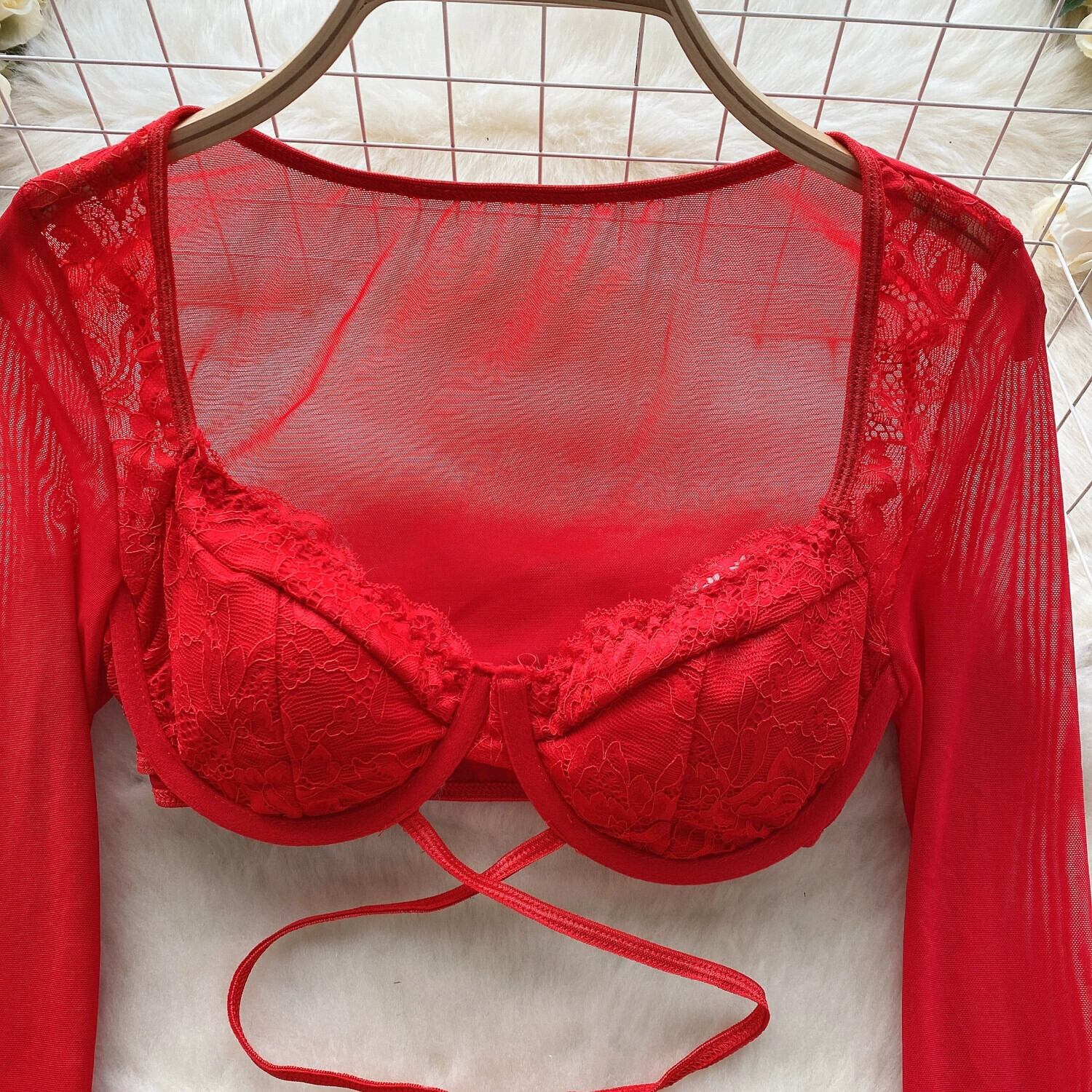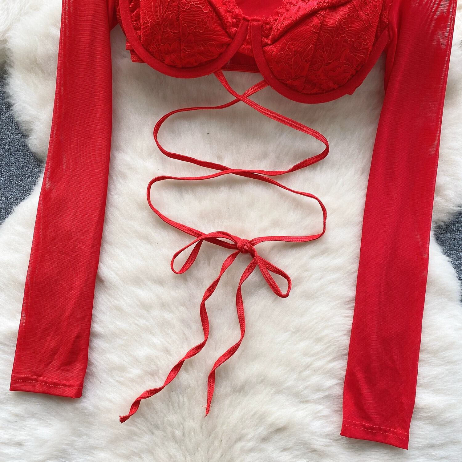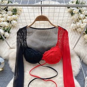 長袖へそ出しシースルーメッシュ Tシャツ女性ヨーロッパとアメリカのインとセクシーなショートクロスタイウエストレーストップ ロング ヨーロピアン lyxaj84640257823