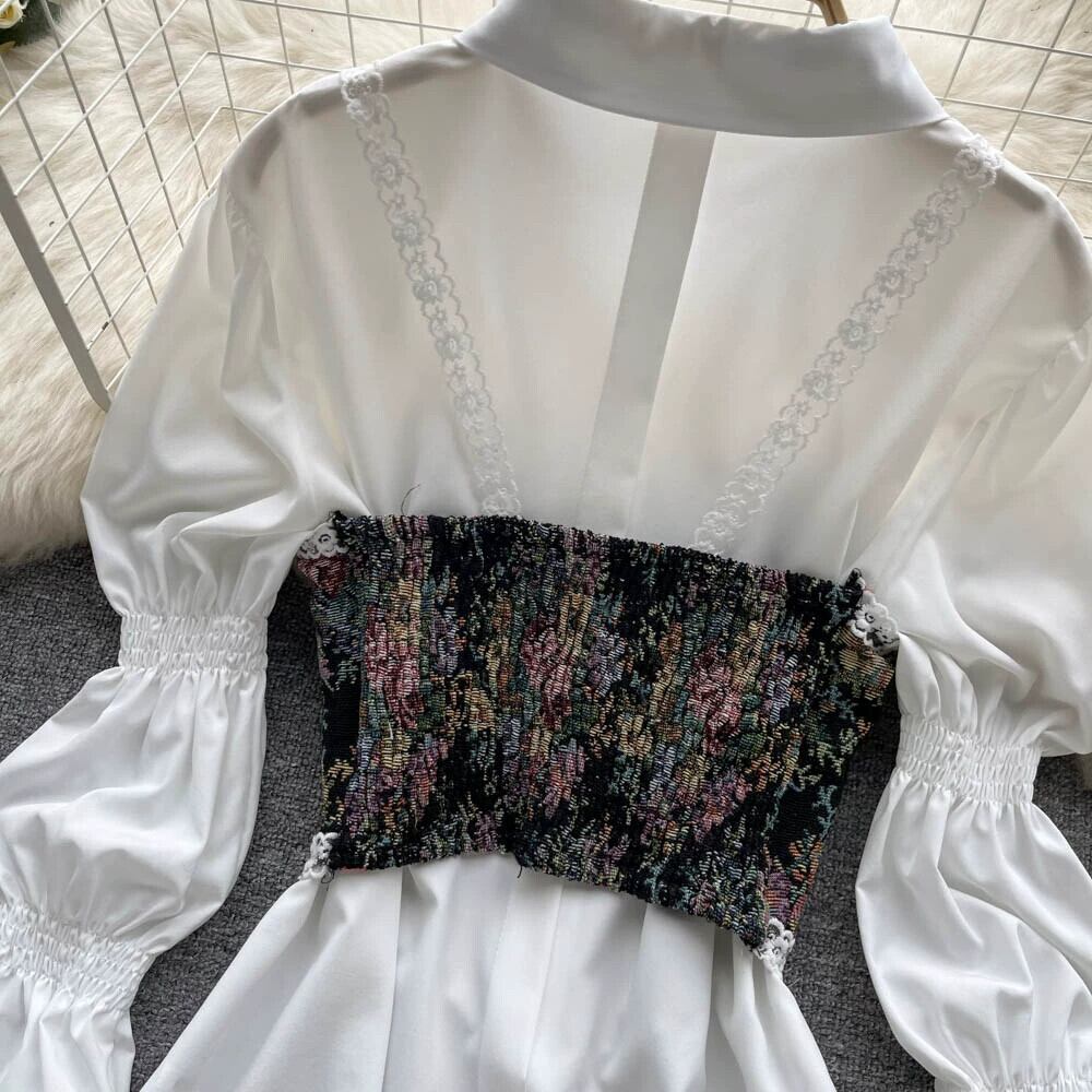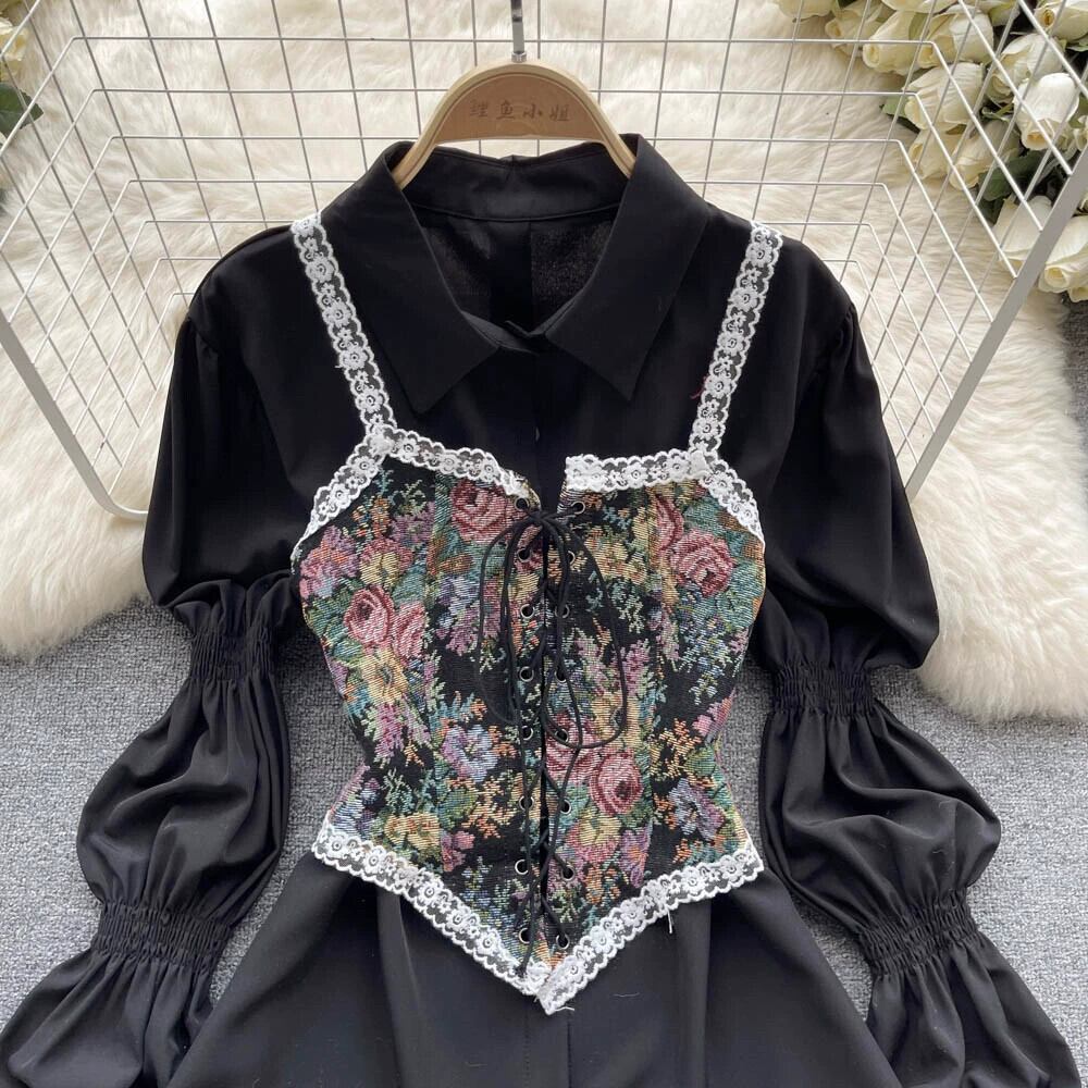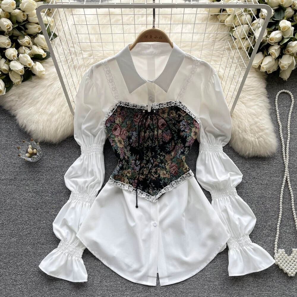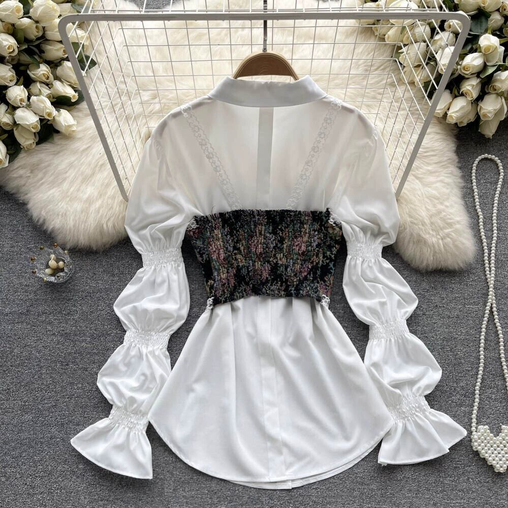 ミッドレングスのルーズパフスリーブシャツ女性 + レーススプライシング刺繍プリントベスト秋のツーピーススーツ オータム 秋物 jie46439222312