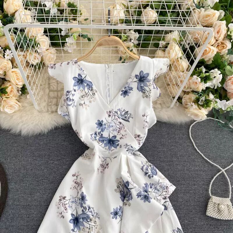 甘いフライングスリーブ、エレガントなVネックデザイン、不規則なフリルウエスト、スリミングショートフローラルドレスレディース 大人ガーリー スウィート キュート カジュアル 花柄 jie80182310317