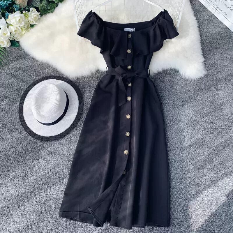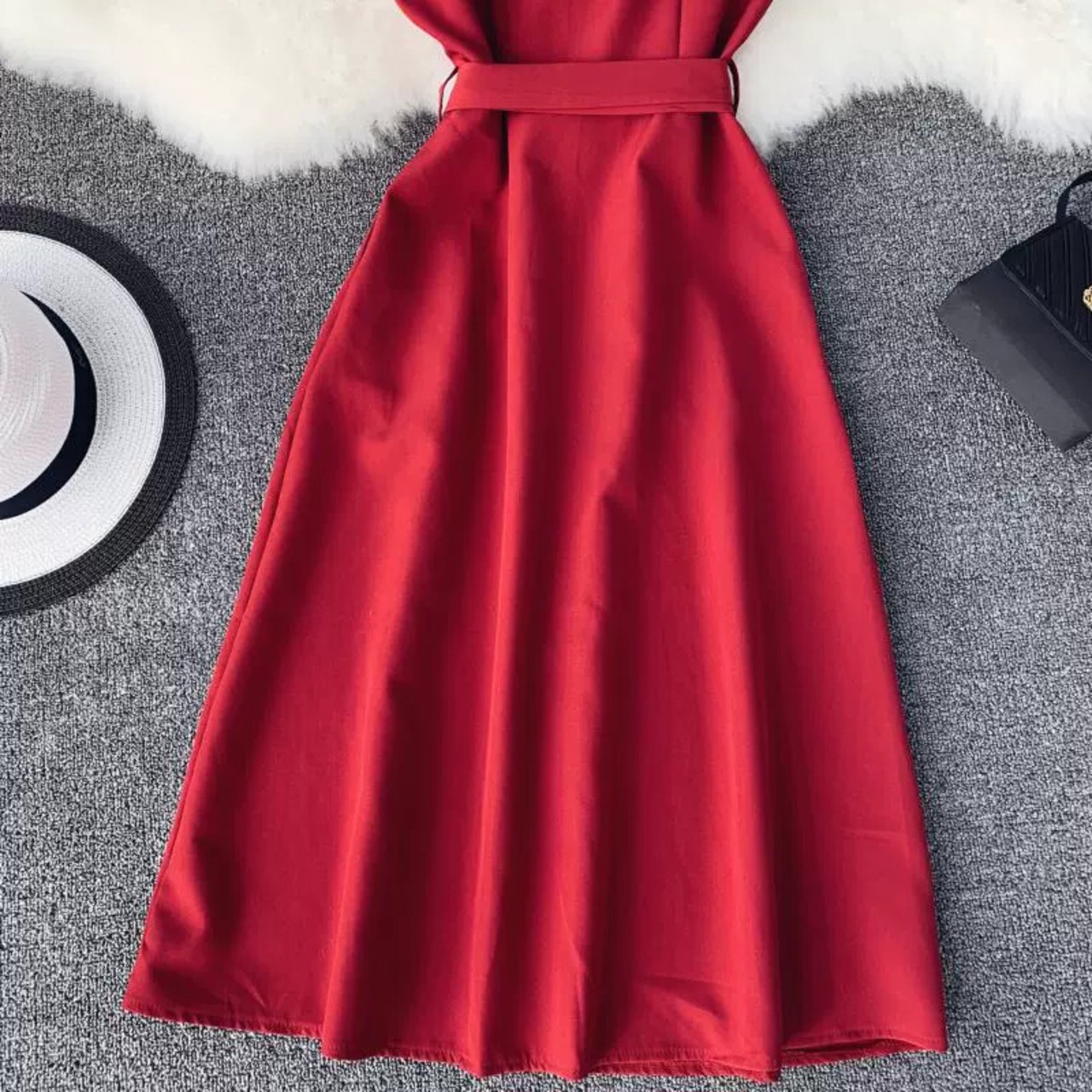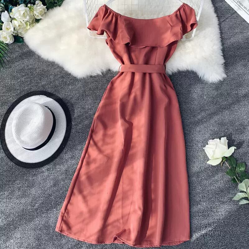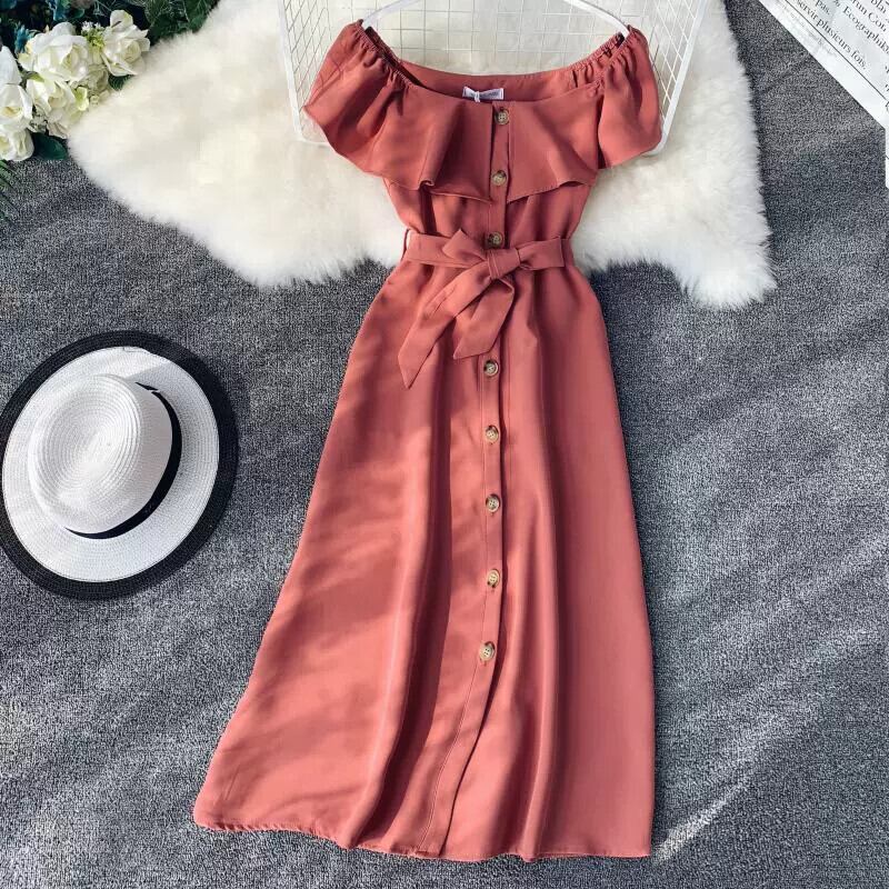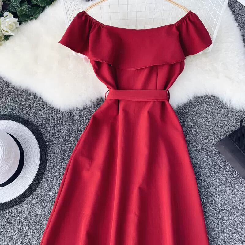 オレンジがかった赤のフロントドアボタンダウンのワンラインカラー、オフショルダー、ウエストを絞った色白の肌を見せるドレス レッド jie63231363915