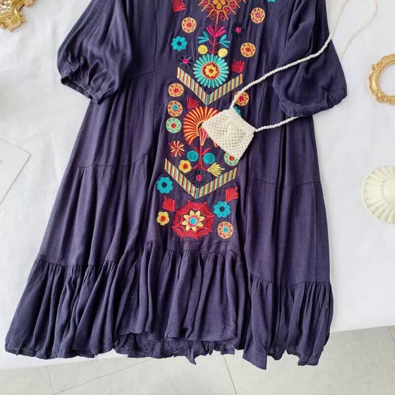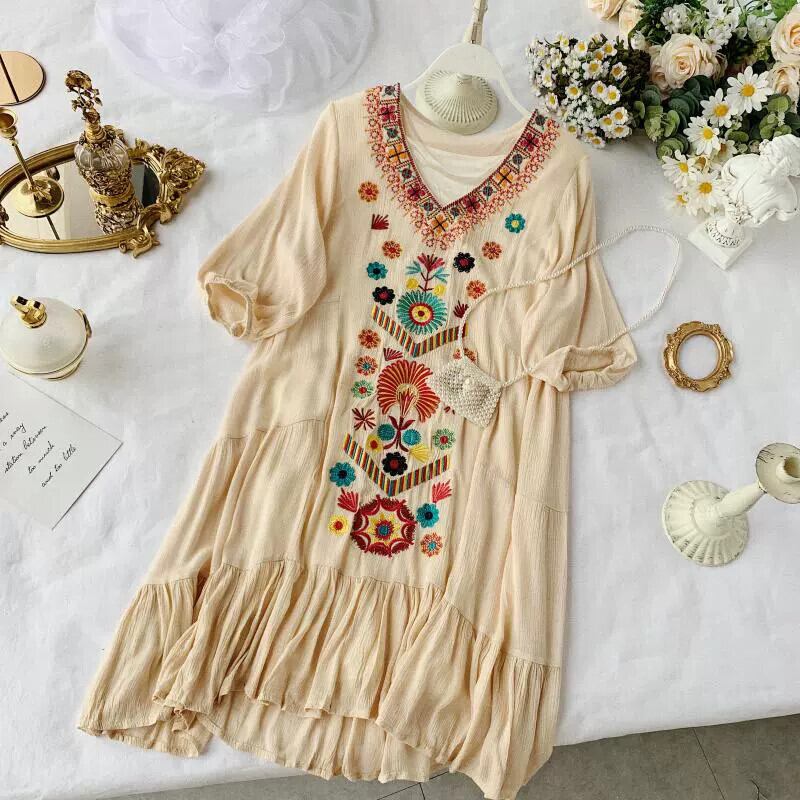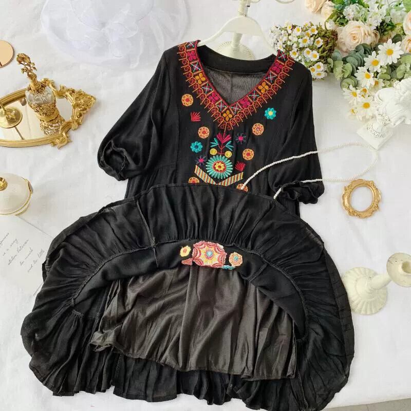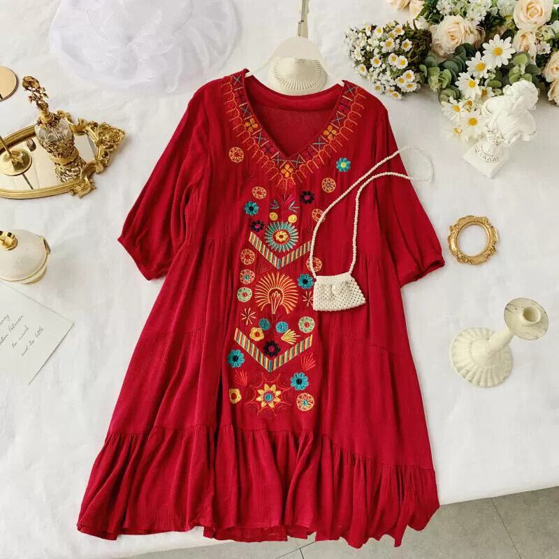 雲南ホリデーエスニックスタイルの刺繍入りドレス、フェミニンなVネック、ルーズ、スリム、ミッドスリーブ、フリルスカート小人 レッド jie17953943814