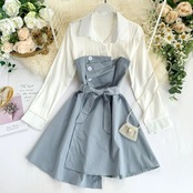 フランスニッチ秋服 2020 新デザインフェイクツーピースコントラストカラーステッチプリーツ不規則なドレス オータム 秋物 jie76963487601