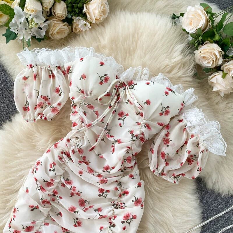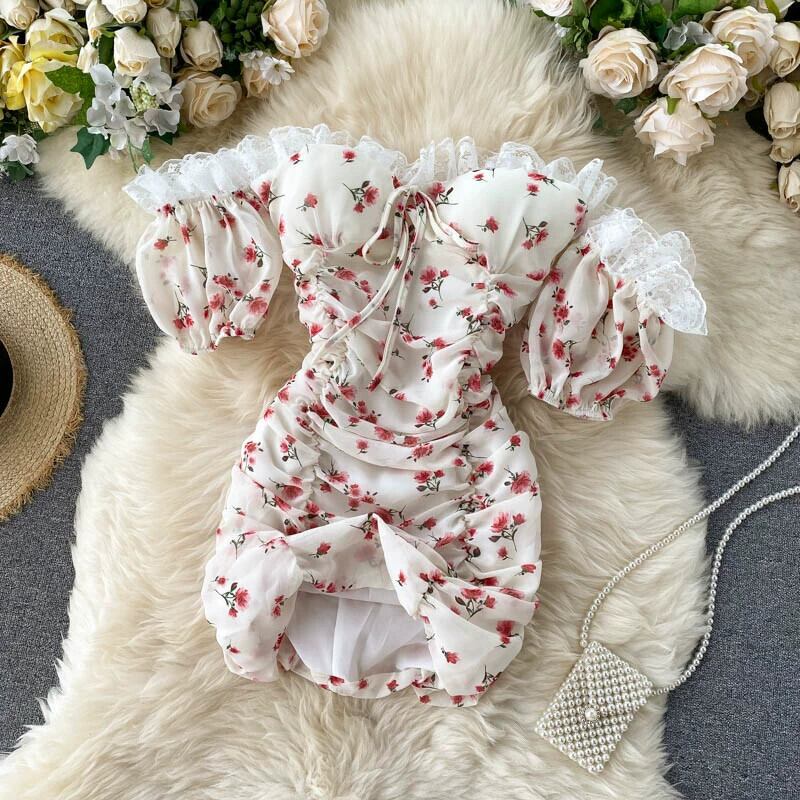 フレンチニッチドレス、スモールドレス、ワンショルダーのセクシーなベスト、ヒップにぴったりフィットするプリーツの花柄ショートスカート jie76999823119