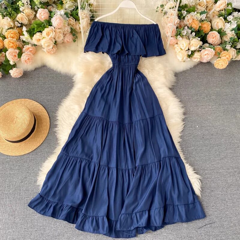 シックな優しいスタイルのロングスカートの女性の夏の海辺の休暇のスカートインフリルワンネックドレス サマー 夏物 jie5884120284