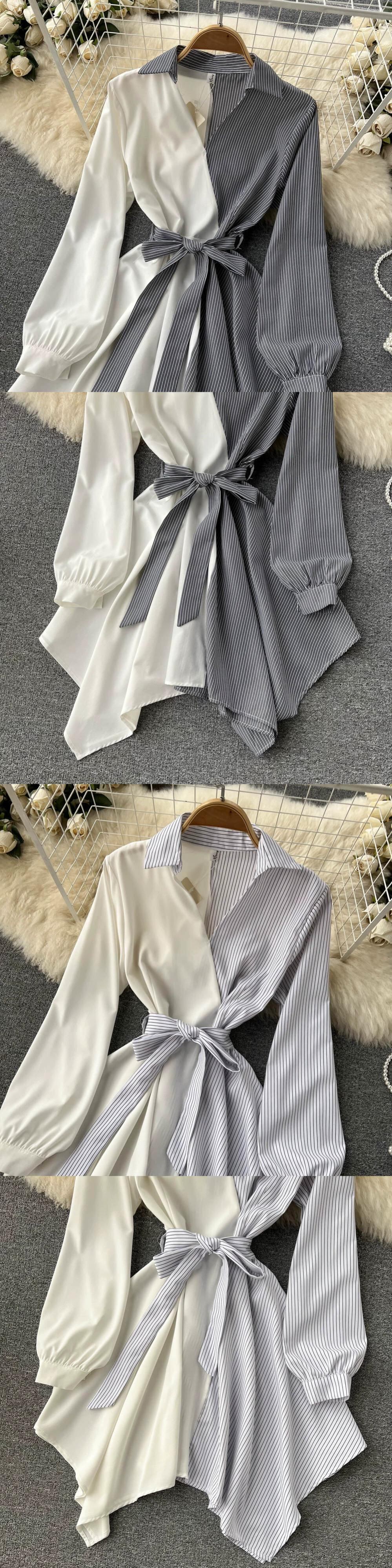 スタイルシックな不規則なカラーブロックストライプラペルレースアップウエスト痩身ミッドレングスエレガントシャツ女性デザイン jie22210206524