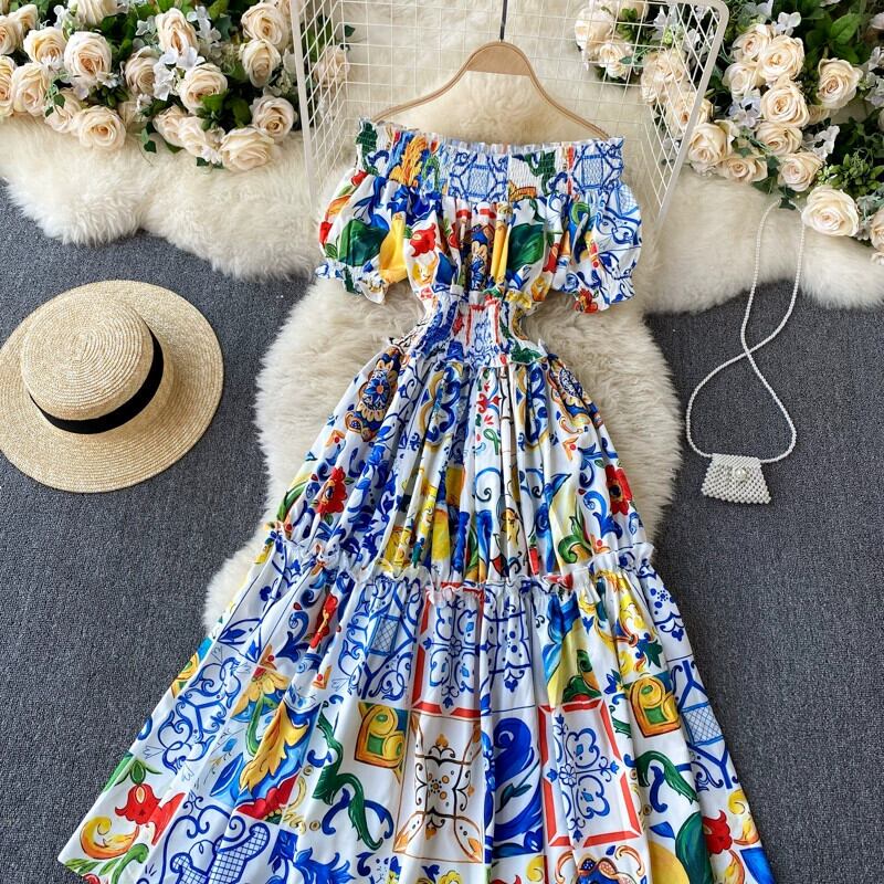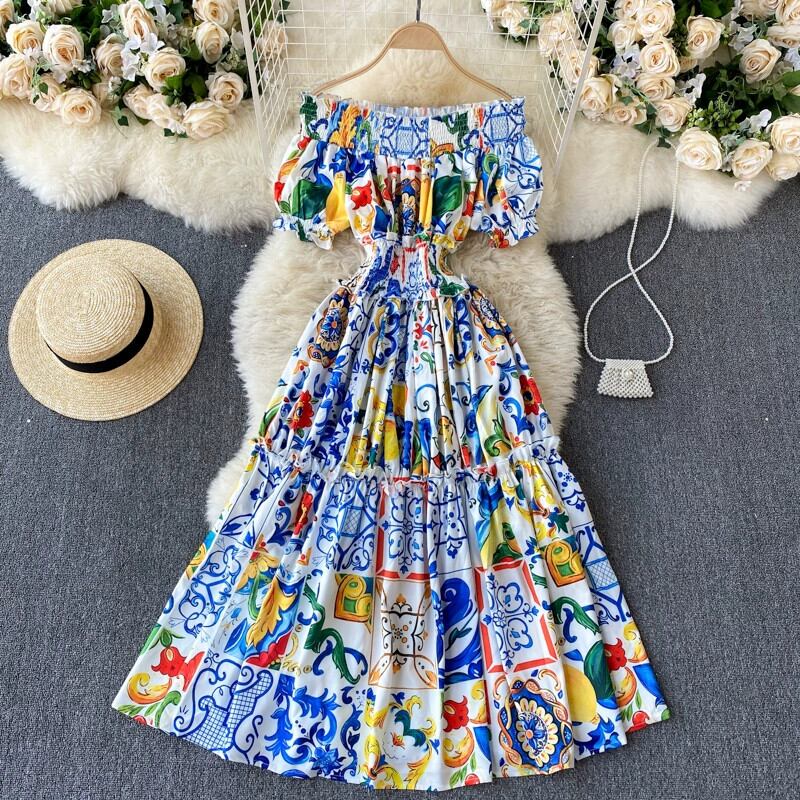 ヨーロッパとアメリカのファッション T スタイルデザインプリントワンラインカラーオフショルダーパフスリーブスリムミドルドレス女性 ヨーロピアン jie46165024552