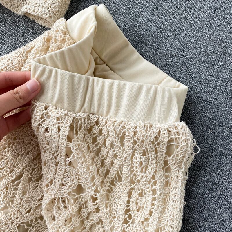 欧米風ネットセレブスーツ スクエアカラーベスト ショートトップ ハイウエストバッグ ヒップ中空デザイン ベルボトム 2点セット ハイウェスト スクウェア ヨーロピアン jie68789043586