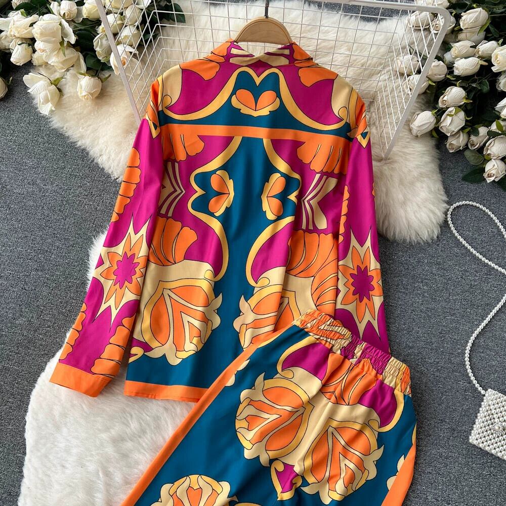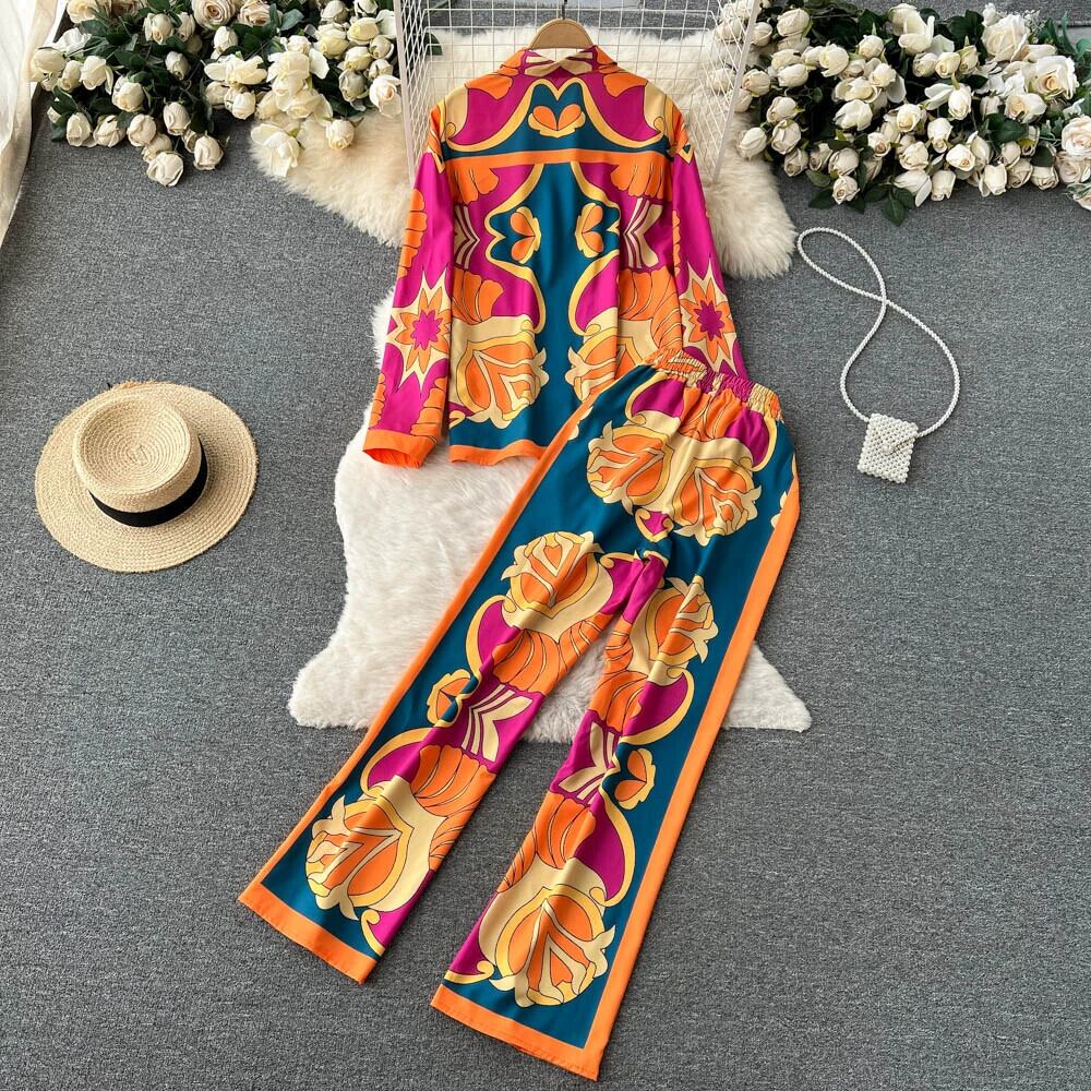 ヨーロッパとアメリカのインスタイルのレトロなパーソナライズされたプリントスーツの女性のラペルシックなシャツ+ドレープワイドレッグロングパンツの2点セット ヨーロピアン jie85055355953