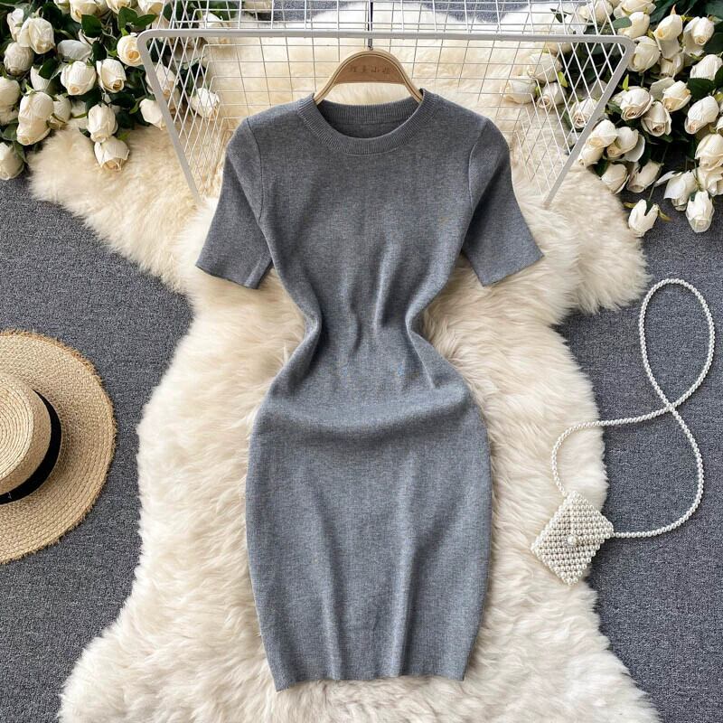ニット半袖ドレス 2022 新しい夏の女性バージョンシンプルな無地の気質スリムショートヒップカバースカート サマー 夏物 ソリッドカラー jie54145139839