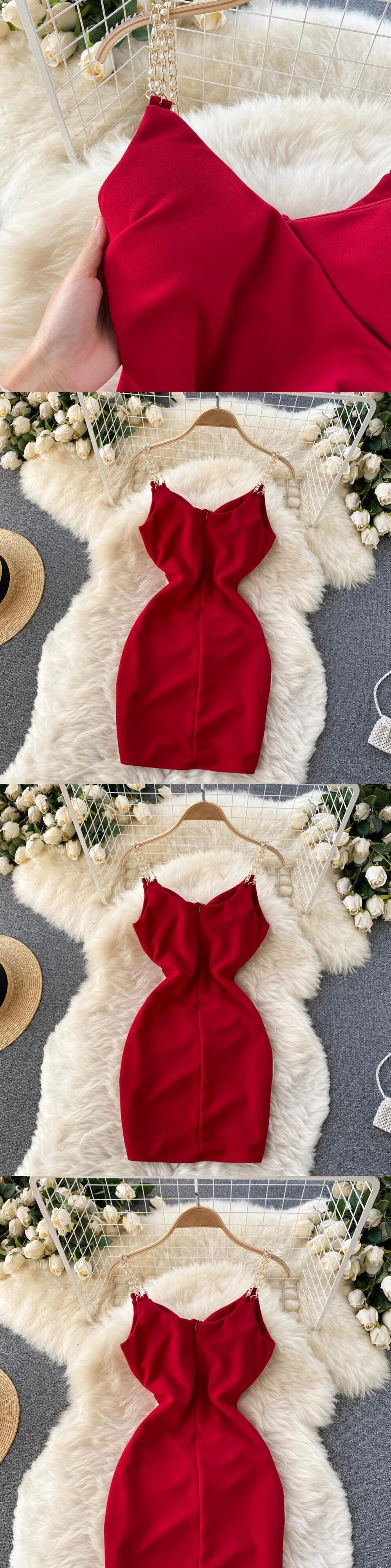軽い大人のスタイルの女性の気質 V ネックセレブドレススリムでスリムな高級チェーンサスペンダードレスヒップハグショートスカート Vネック jie95799665289