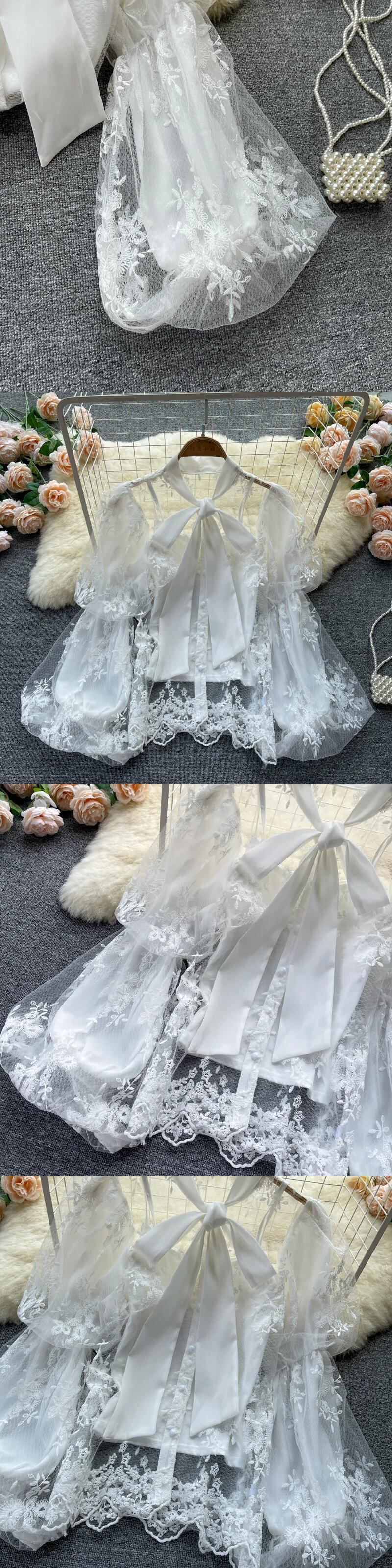 2022初秋の新スタイルスーパーフェアリー蝶ネクタイパフスリーブレースシフォンシャツメッシュ刺繍中空トップ レッド リボン オータム 秋物 jie59357101650