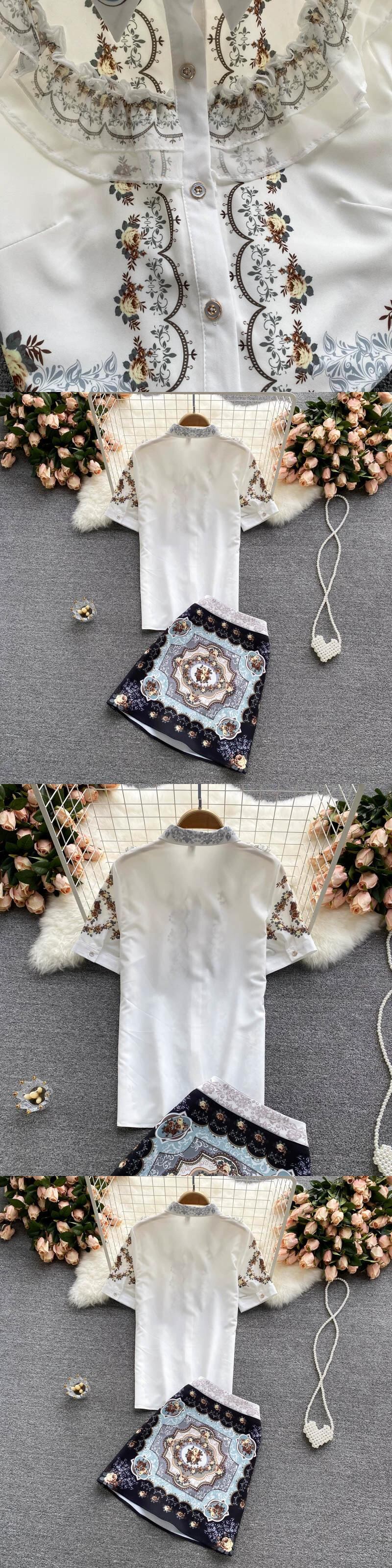 おしとやかな気質のスーツの女性の夏の半袖シャツの女性のデザインニッチプリントハイウエストスカートのトレンディなツーピースセット サマー 夏物 jie61022005555