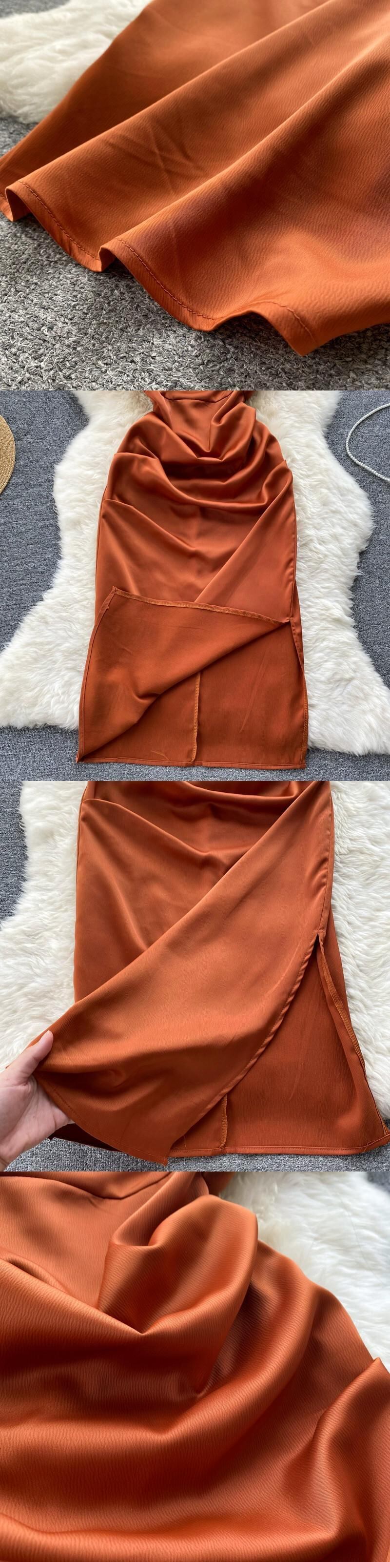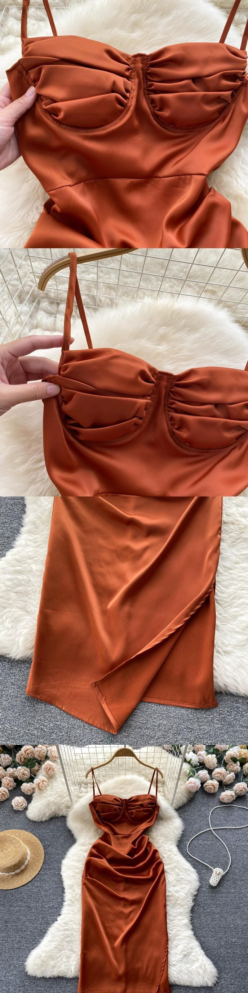フレンチレトロな雰囲気のサテンサスペンダースカートレディース、軽やかな高級スリット、イレギュラースリットカラー、プリーツセクシードレス、トレンド jie90398360016