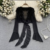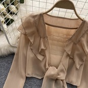 フレンチデザインスーパーフェアリールーズシャツシフォンショートvネックストラップベルスリーブトップ女性長袖夏 ロング サマー 夏物 jie31356269620