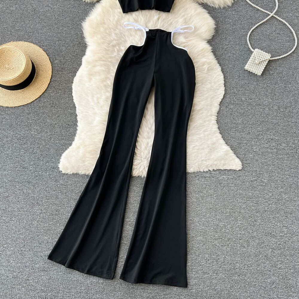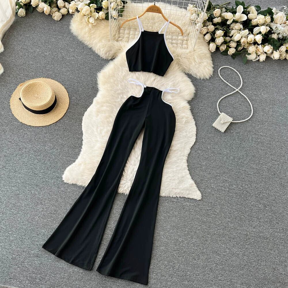 ネットセレブ人気のツーピーススーツレディース、夏用ショートキャミソール、中空ハイウエストカジュアルロングパンツ、トレンド サマー 夏物 jie72511744788