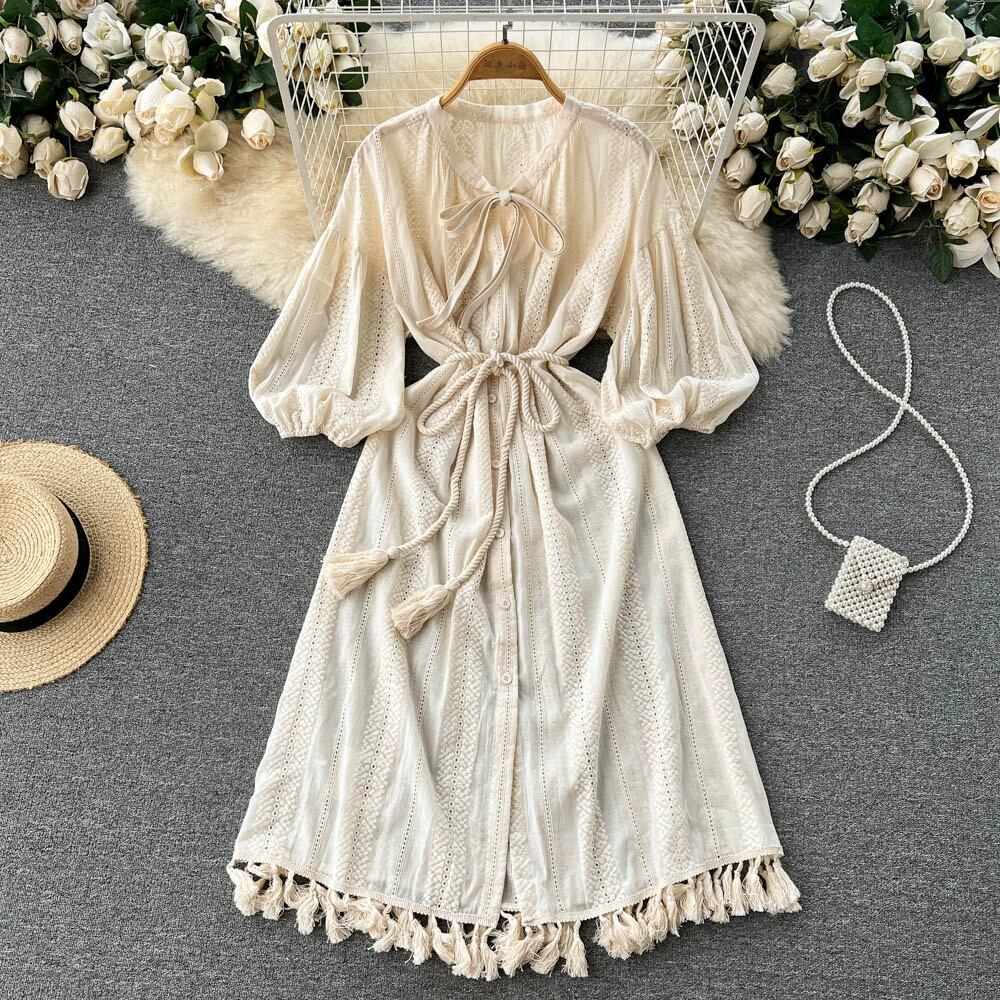 ボヘミアンリゾートスタイルレトロランタンスリーブドレス夏のレディースフレンチウエストフローVネックシャツロングスカート サマー 夏物 jie97759719749
