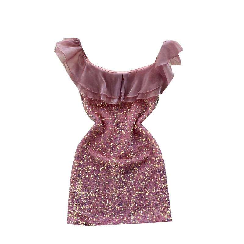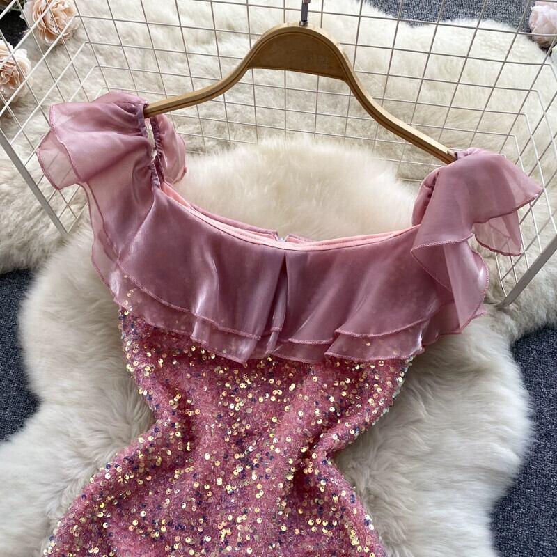 甘いフリルワンラインカラードレス夏の女性の 2022 新しい重工業スパンコール社交家小さなドレスショートスカート 大人ガーリー スウィート キュート カジュアル サマー 夏物 jie48378106667
