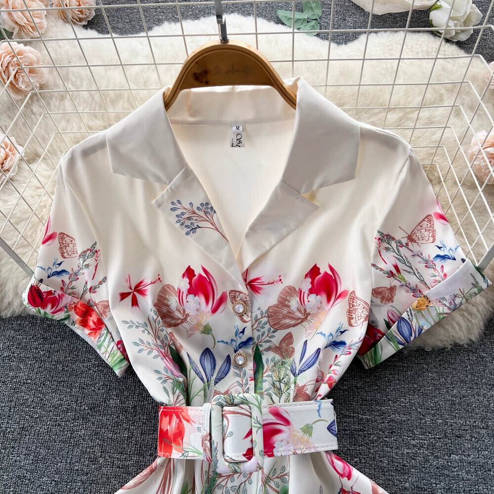 夏の新しいスタイルのスーツの襟エレガントな女性のウエストプリントシフォンドレス女性半袖甘いプリーツ妖精スカート 大人ガーリー スウィート キュート カジュアル サマー 夏物 jie29234563191