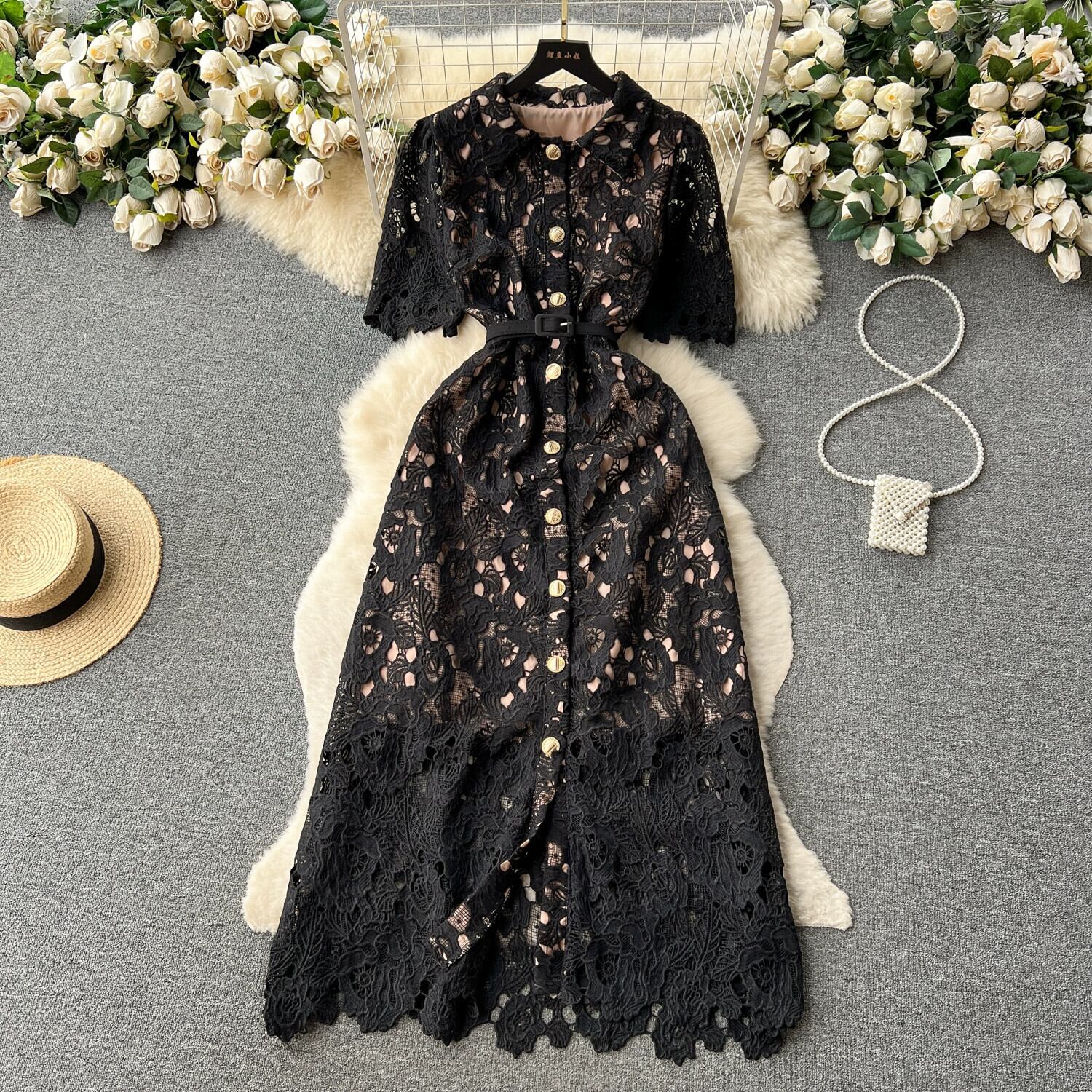 -終了絶妙なドレス2023新しい女神風の気質ポロ襟レトロ重工業中空レースロングスカート jie70277953936