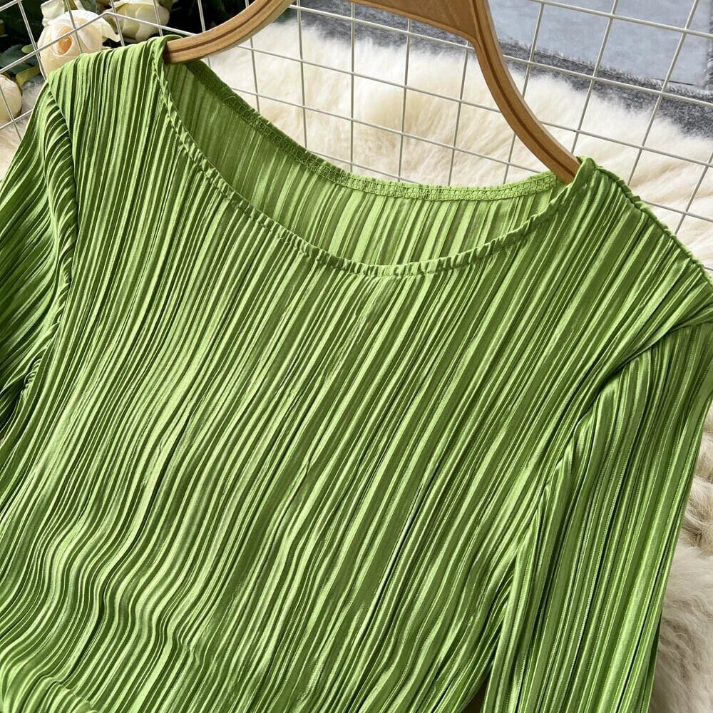 ヨーロッパとアメリカンスタイルの 2022 秋の新ファッションプリーツカジュアル無地ラウンドネック長袖スリムプリーツヒップドレス ロング オータム 秋物 Oネック ソリッドカラー ヨーロピアン jie4722605393