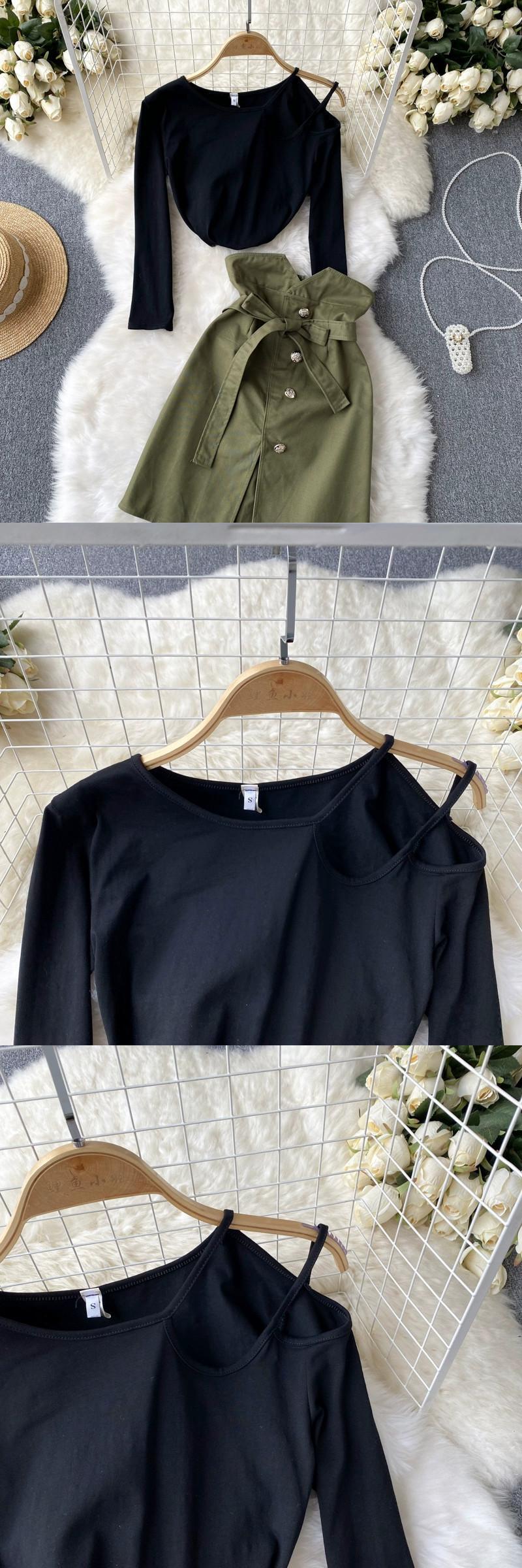 春と秋の気質レトロスタイル中空ホルター不規則なトップ + リボンスリットスカートツーピーススーツ女性 スプリング 春物 オータム 秋物 jie41285444602
